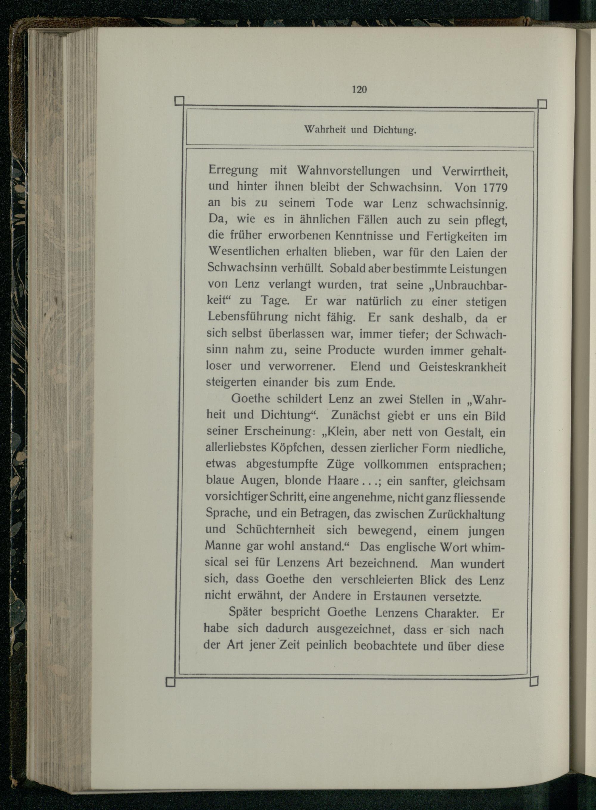 Goethe schildert Lenz an zwei Stellen in„Wahrheit und Dichtung“. Zunächst giebt er uns ein Bild seiner Erscheinung:„Klein, aber nett von Gestalt, ein allerliebstes Köpfchen, dessen zierlicher Form niedliche, etwas abgestumpfte Züge vollkommen entsprachen; blaue Augen, blonde Haare...; ein sanfter, gleichsam vorsichtiger Schritt, eine angenehme, nicht ganz fliessende Sprache, und ein Betragen, das zwischen Zurückhaltung und Schüchternheit sich bewegend, einem jungen Manne gar wohl anstand.“ Das englische Wort whimsical sei für Lenzens Art bezeichnend. Man wundert sich, dass Goethe den verschleierten Blick des Lenz nicht erwähnt, der Andere in Erstaunen versetzte.