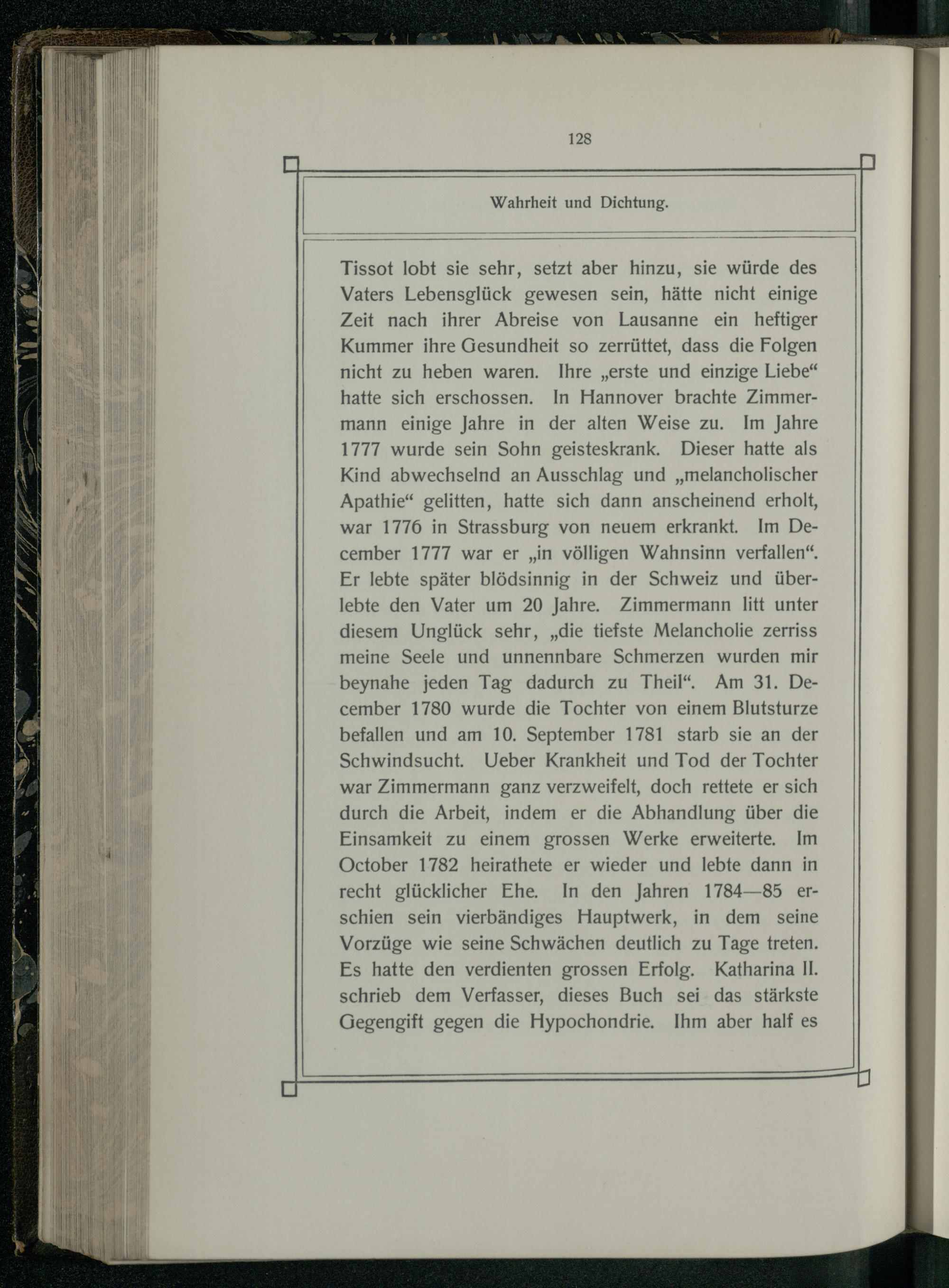 Tissot lobt sie sehr, setzt aber hinzu, sie würde des Vaters Lebensglück gewesen sein, hätte nicht einige Zeit nach ihrer Abreise von Lausanne ein heftiger Kummer ihre Gesundheit so zerrüttet, dass die Folgen nicht zu heben waren. Ihre„erste und einzige Liebe“ hatte sich erschossen. In Hannover brachte Zimmermann einige Jahre in der alten Weise zu. Im Jahre 1777 wurde sein Sohn geisteskrank. Dieser hatte als Kind abwechselnd an Ausschlag und„melancholischer Apathie“ gelitten, hatte sich dann anscheinend erholt, war 1776 in Strassburg von neuem erkrankt. Im December 1777 war er„in völligen Wahnsinn verfallen“. Er lebte später blödsinnig in der Schweiz und überlebte den Vater um 20 Jahre. Zimmermann litt unter diesem Unglück sehr,„die tiefste Melancholie zerriss meine Seele und unnennbare Schmerzen wurden mir beynahe jeden Tag dadurch zu Theil“ Am 31. December 1780 wurde die Tochter von einem Blutsturze befallen und am 10. September 1781 starb sie an der Schwindsucht. Ueber Krankheit und Tod der Tochter war Zimmermann ganz verzweifelt, doch rettete er sich durch die Arbeit, indem er die Abhandlung über die Einsamkeit zu einem grossen Werke erweiterte. Im October 1782 heirathete er wieder und lebte dann in recht glücklicher Ehe. In den Jahren 1784—85 erschien sein vierbändiges Hauptwerk, in dem seine Vorzüge wie seine Schwächen deutlich zu Tage treten. Es hatte den verdienten grossen Erfolg. Katharina II. schrieb dem Verfasser, dieses Buch sei das stärkste Gegengift gegen die Hypochondrie. Ihm aber half es