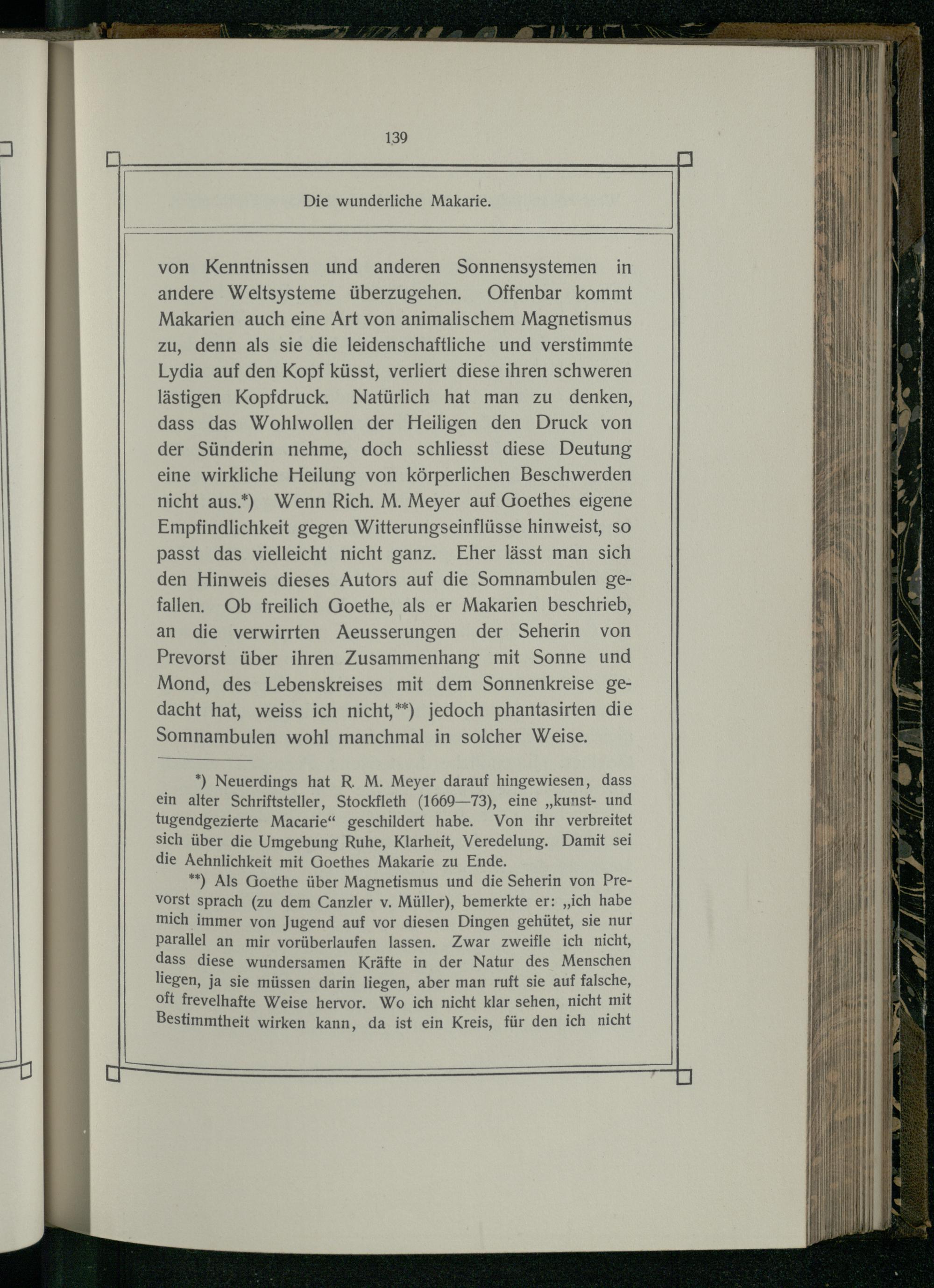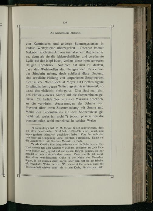 von Kenntnissen und anderen Sonnensystemen in andere Weltsysteme überzugehen. Offenbar kommt Makarien auch eine Art von animalischem Magnetismus zu, denn als sie die leidenschaftliche und verstimmte Lydia auf den Kopf küsst, verliert diese ihren schweren lästigen Kopfdruck. Natürlich hat man zu denken, dass das Wohlwollen der Heiligen den Druck von der Sünderin nehme, doch schliesst diese Deutung eine wirkliche Heilung von körperlichen Beschwerden nicht aus.*) Wenn Rich. M. Meyer auf Goethes eigene Empfindlichkeit gegen Witterungseinflüsse hinweist, so passt das vielleicht nicht ganz. Eher lässt man sich den Hinweis dieses Autors auf die Somnambulen gefallen. Ob freilich Goethe, als er Makarien beschrieb, an die verwirrten Aeusserungen der Seherin von