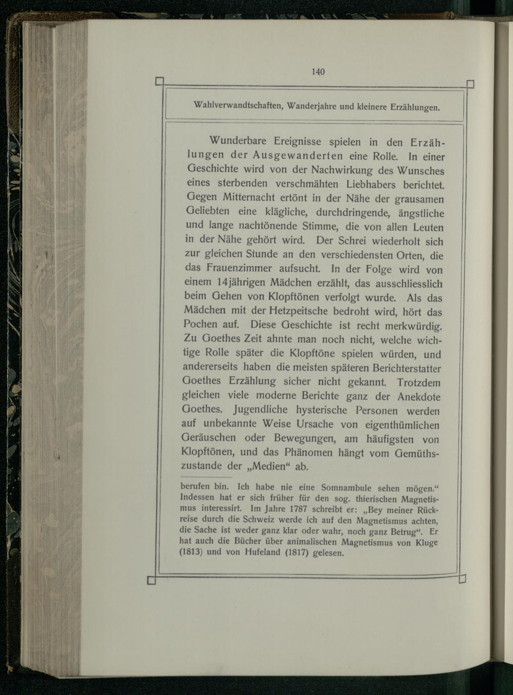 berufen bin. Ich habe nie eine Somnambule sehen mögen.“ Indessen hat er sich früher für den sog. thierischen Magnetismus interessirt. Im Jahre 1787 schreibt er:„Bey meiner Rückreise durch die Schweiz werde ich auf den Magnetismus achten, die Sache ist weder ganz klar oder wahr, noch ganz Betrug“. Er hat auch die Bücher über animalischen Magnetismus von Kluge (1813) und von Hufeland(1817) gelesen.