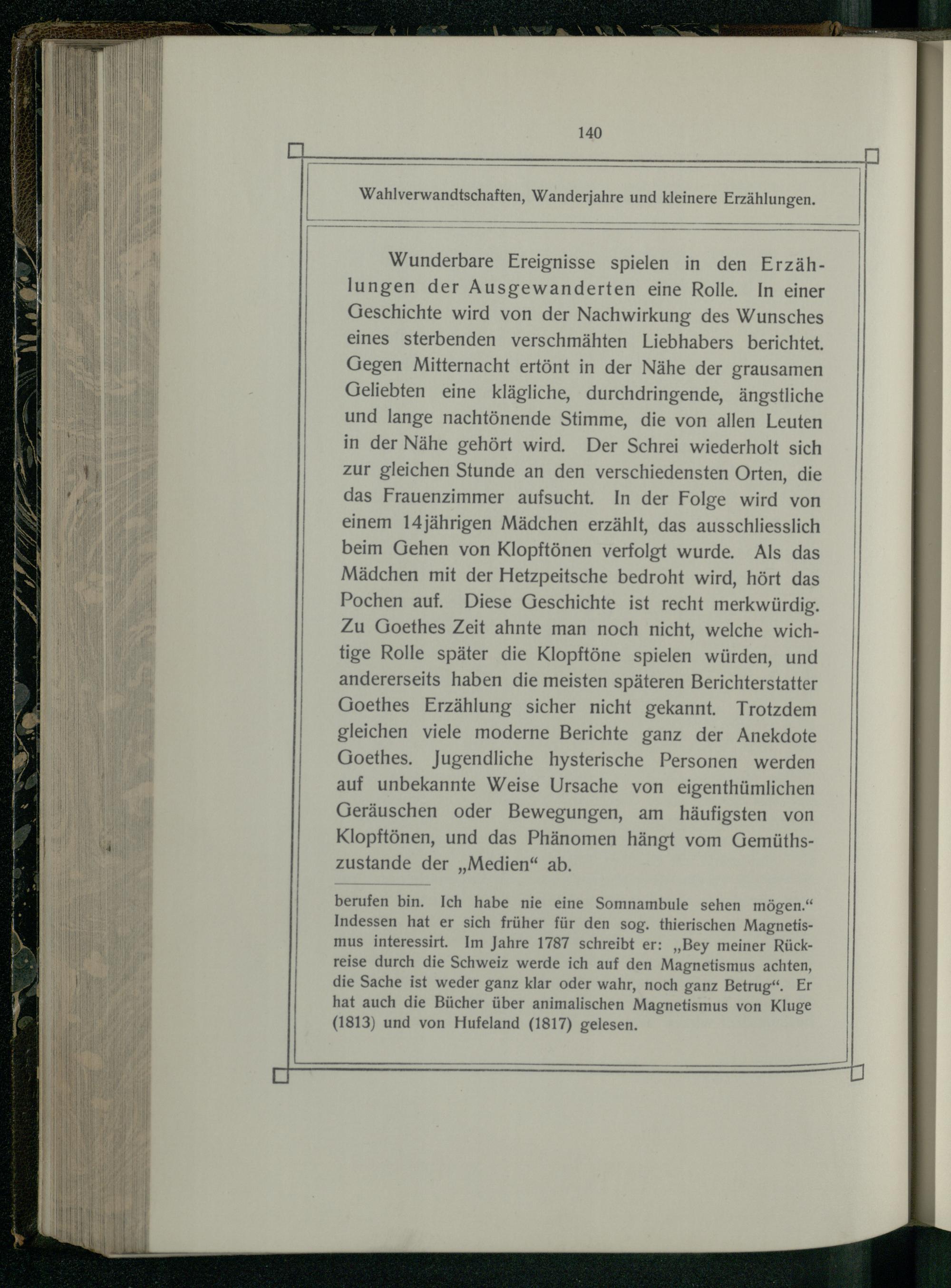 Wunderbare Ereignisse spielen in den Erzählungen der Ausgewanderten eine Rolle. In einer Geschichte wird von der Nachwirkung des Wunsches eines sterbenden verschmähten Liebhabers berichtet. Gegen Mitternacht ertönt in der Nähe der grausamen Geliebten eine klägliche, durchdringende, ängstliche und lange nachtönende Stimme, die von allen Leuten in der Nähe gehört wird. Der Schrei wiederholt sich zur gleichen Stunde an den verschiedensten Orten, die das Frauenzimmer aufsucht. In der Folge wird von einem 14jährigen Mädchen erzählt, das ausschliesslich beim Gehen von Klopftönen verfolgt wurde. Als das Mädchen mit der Hetzpeitsche bedroht wird, hört das Pochen auf. Diese Geschichte ist recht merkwürdig. Zu Goethes Zeit ahnte man noch nicht, welche wichtige Rolle später die Klopftöne spielen würden, und andererseits haben die meisten späteren Berichterstatter Goethes Erzählung sicher nicht gekannt. Trotzdem gleichen viele moderne Berichte ganz der Anekdote Goethes. Jugendliche hysterische Personen werden auf unbekannte Weise Ursache von eigenthümlichen Geräuschen oder Bewegungen, am häufigsten von Klopftönen, und das Phänomen hängt vom Gemüthszustande der„Medien“ ab.