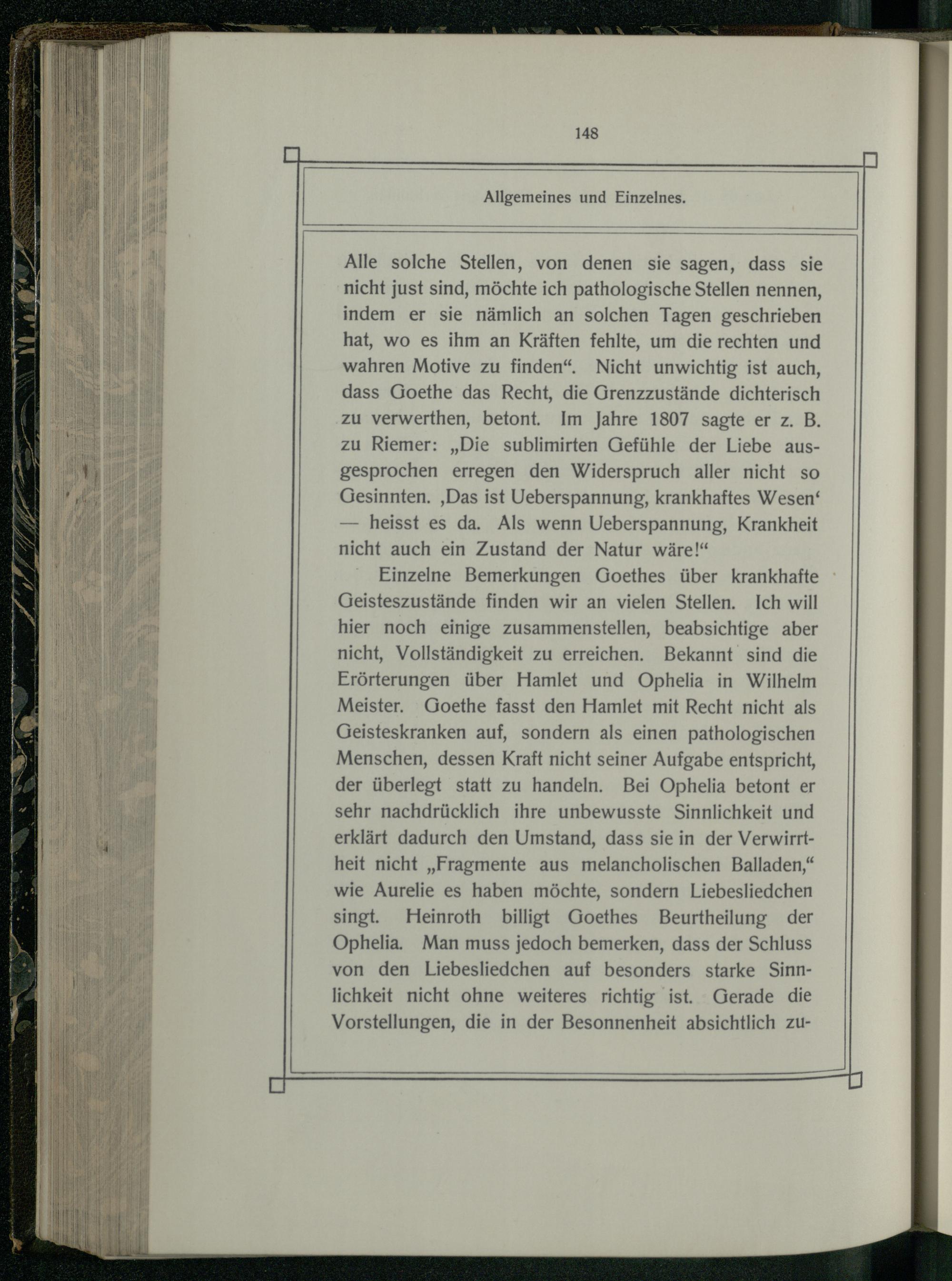 Alle solche Stellen, von denen sie sagen, dass sie nicht just sind, möchte ich pathologische Stellen nennen, indem er sie nämlich an solchen Tagen geschrieben hat, wo es ihm an Kräften fehlte, um die rechten und wahren Motive zu finden“. Nicht unwichtig ist auch, dass Goethe das Recht, die Grenzzustände dichterisch zu verwerthen, betont. Im Jahre 1807 sagte er z. B. zu Riemer:„Die sublimirten Gefühle der Liebe ausgesprochen erregen den Widerspruch aller nicht so Gesinnten. ‚Das ist Ueberspannung, krankhaftes Wesen‘ — heisst es da. Als wenn Ueberspannung, Krankheit nicht auch ein Zustand der Natur wäre!“