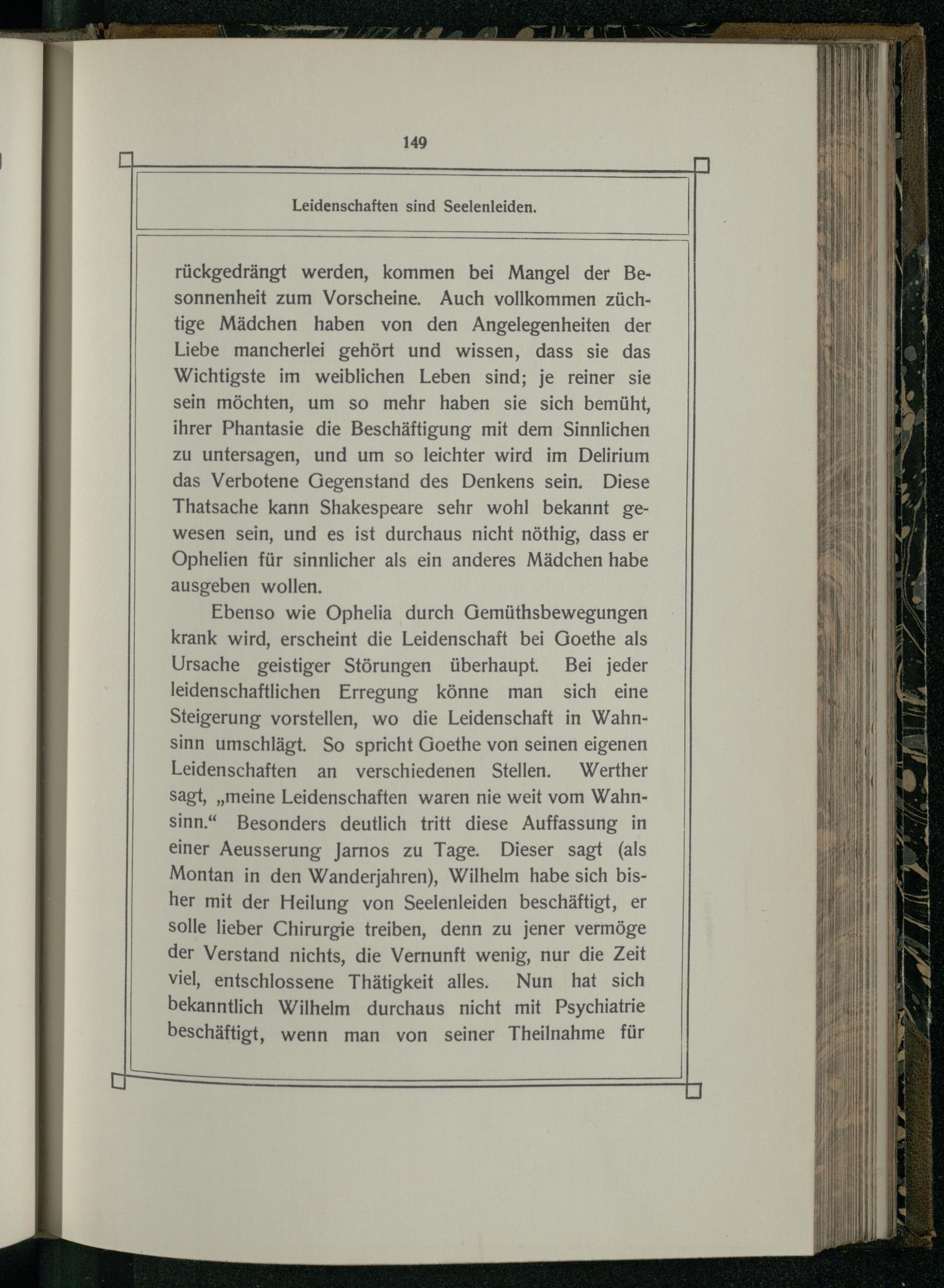 Ebenso wie Ophelia durch Gemüthsbewegungen krank wird, erscheint die Leidenschaft bei Goethe als Ursache geistiger Störungen überhaupt. Bei jeder leidenschaftlichen Erregung könne man sich eine Steigerung vorstellen, wo die Leidenschaft in Wahnsinn umschlägt. So spricht Goethe von seinen eigenen Leidenschaften an verschiedenen Stellen. Werther sagt,„meine Leidenschaften waren nie weit vom Wahnsinn.“ Besonders deutlich tritt diese Auffassung in einer Aeusserung Jarnos zu Tage. Dieser sagt(als Montan in den Wanderjahren), Wilhelm habe sich bisher mit der Heilung von Seelenleiden beschäftigt, er solle lieber Chirurgie treiben, denn zu jener vermöge der Verstand nichts, die Vernunft wenig, nur die Zeit viel, entschlossene Thätigkeit alles. Nun hat sich bekanntlich Wilhelm durchaus nicht mit Psychiatrie beschäftigt, wenn man von seiner Theilnahme für