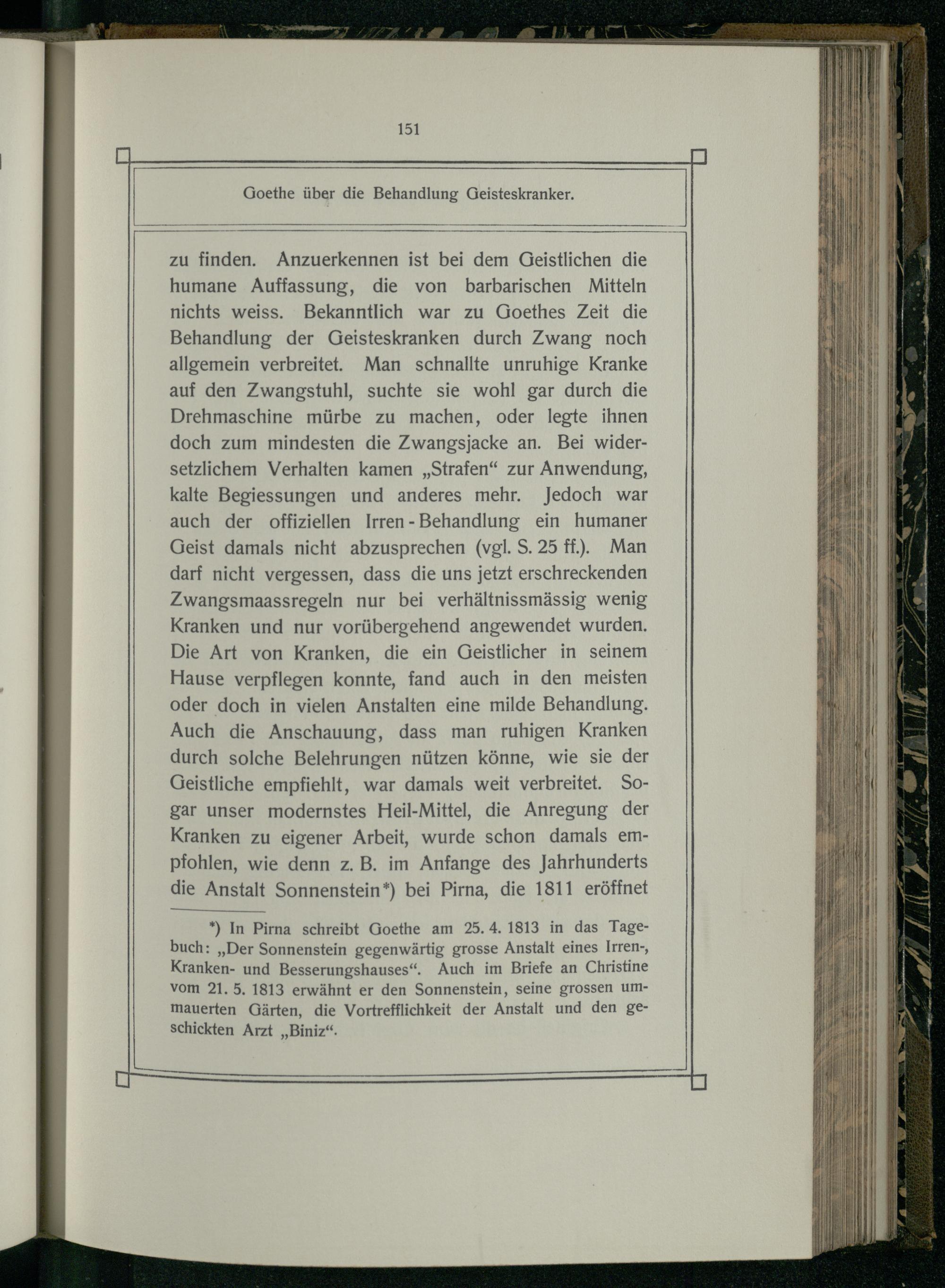 *) In Pirna schreibt Goethe am 25.4. 1813 in das Tagebuch:„Der Sonnenstein gegenwärtig grosse Anstalt eines Irren-, Kranken- und Besserungshauses“. Auch im Briefe an Christine vom 21. 5. 1813 erwähnt er den Sonnenstein, seine grossen ummauerten Gärten, die Vortrefflichkeit der Anstalt und den geschickten Arzt„Biniz“.