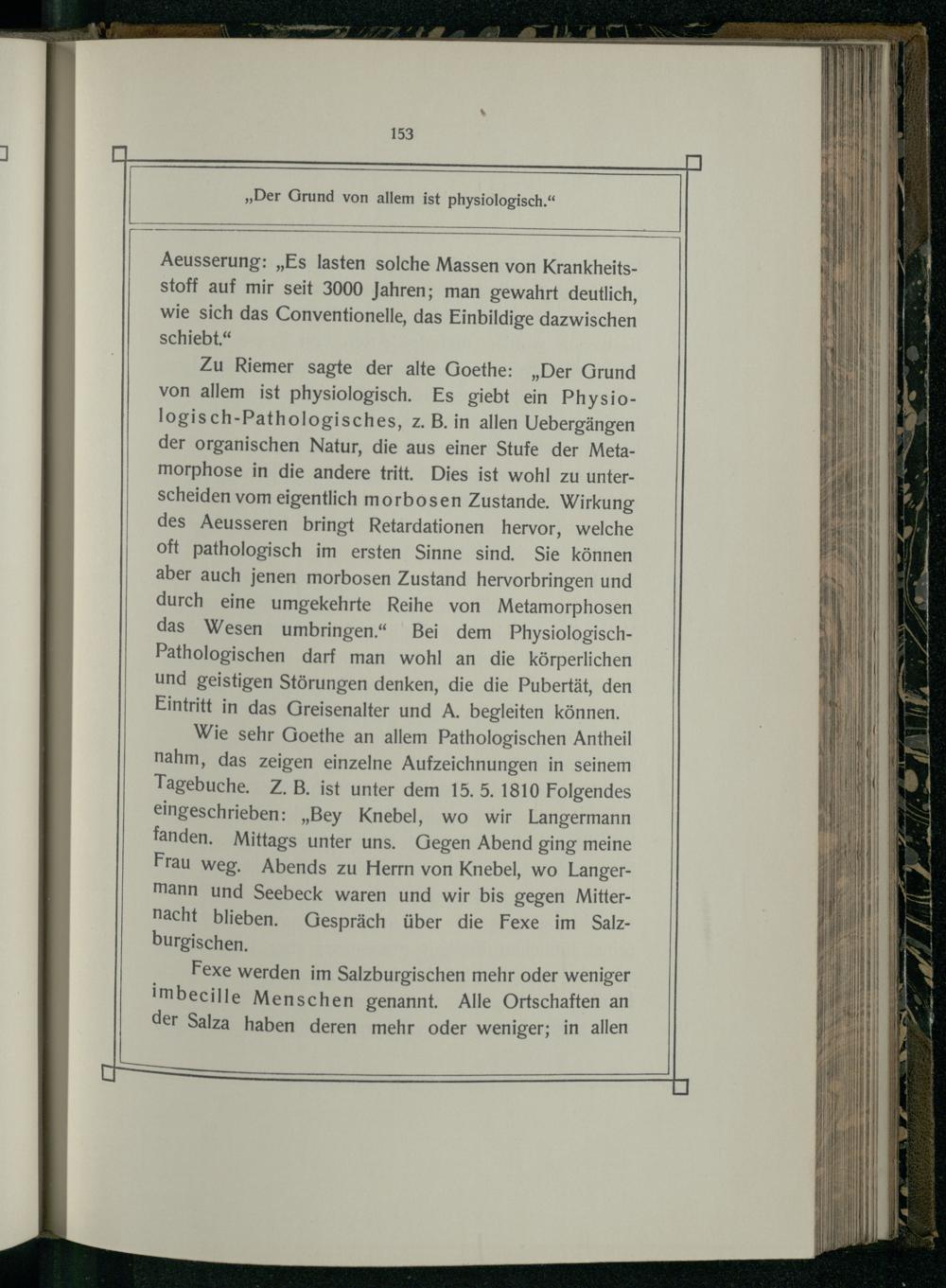 Wie sehr Goethe an allem Pathologischen Antheil nahm, das zeigen einzelne Aufzeichnungen in seinem Tagebuche. Z,B. ist unter dem 15. 5. 1810 Folgendes eingeschrieben:„Bey Knebel, wo wir Langermann fanden, Mittags unter uns. Gegen Abend ging meine Frau weg. Abends zu Herrn von Knebel, wo Langermann und Seebeck waren und wir bis gegen Mitternacht blieben. Gespräch über die Fexe im Salzburgischen.