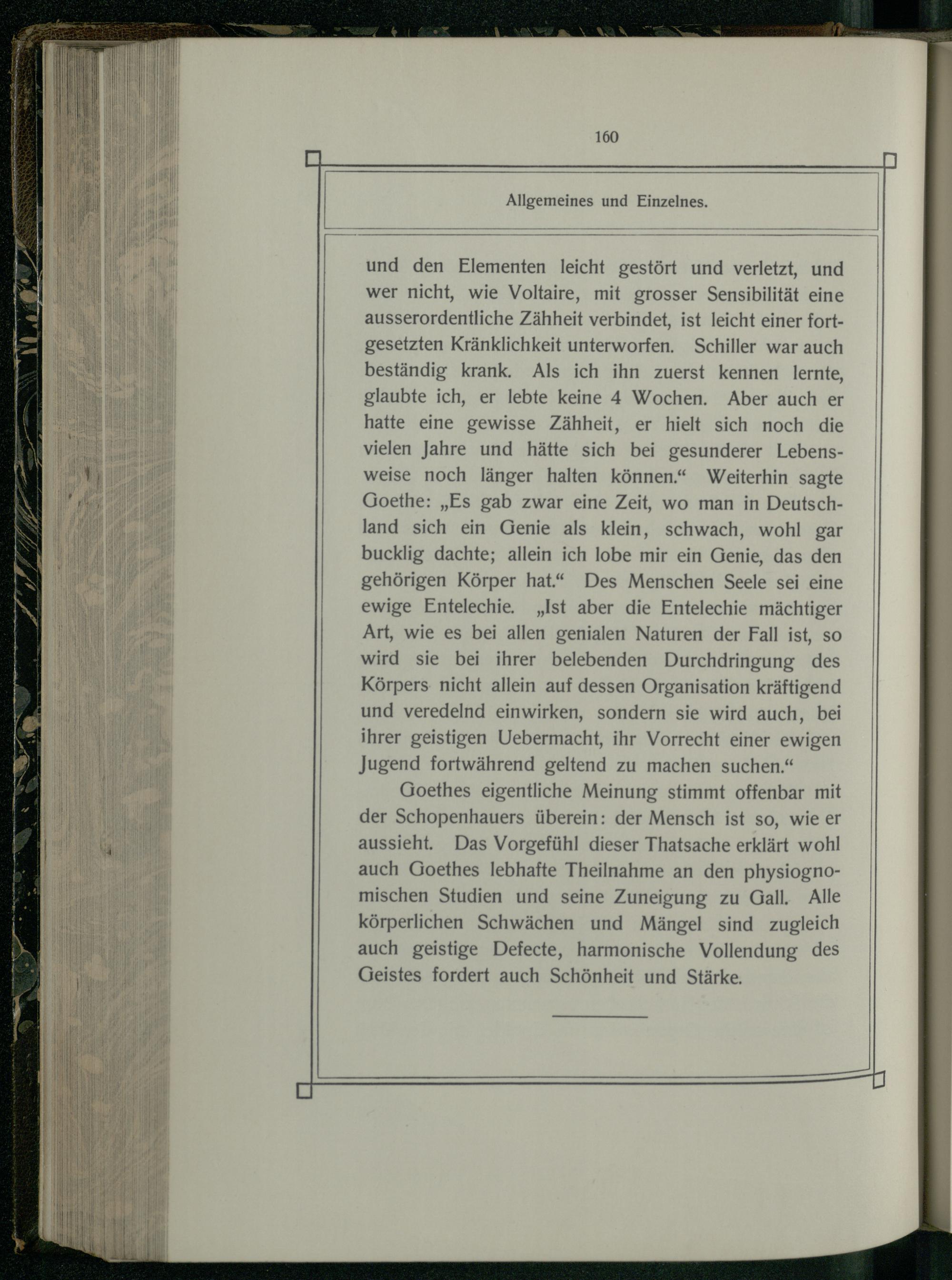 Goethes eigentliche Meinung stimmt offenbar mit der Schopenhauers überein: der Mensch ist so, wie er aussieht. Das Vorgefühl dieser Thatsache erklärt wohl auch Goethes lebhafte Theilnahme an den physiognomischen Studien und seine Zuneigung zu Gall. Alle körperlichen Schwächen und Mängel sind zugleich auch geistige Defecte, harmonische Vollendung des Geistes fordert auch Schönheit und Stärke.