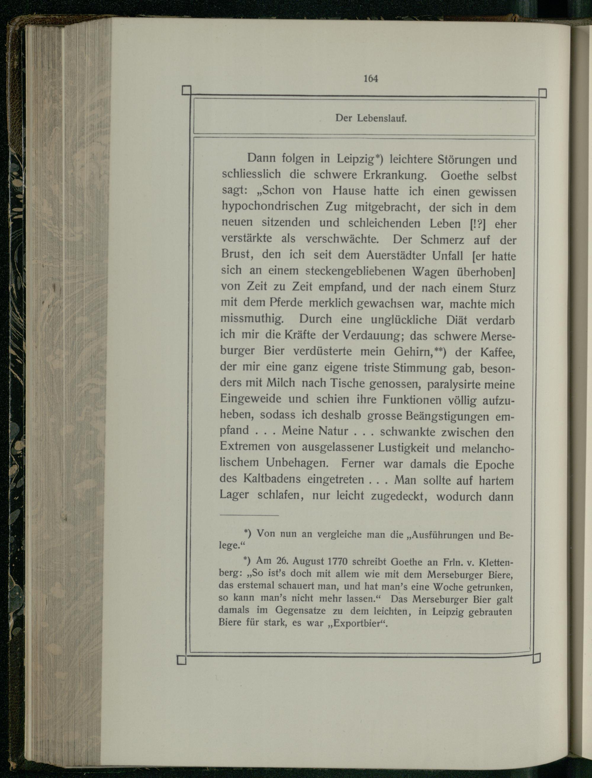 Dann folgen in Leipzig*) leichtere Störungen und schliesslich die schwere Erkrankung. Goethe selbst sagt:„Schon von Hause hatte ich einen gewissen hypochondrischen Zug mitgebracht, der sich in dem neuen sitzenden und schleichenden Leben[!?] eher verstärkte als verschwächte. Der Schmerz auf der Brust, den ich seit dem Auerstädter Unfall[er hatte sich an einem steckengebliebenen Wagen überhoben] von Zeit zu Zeit empfand, und der nach einem Sturz mit dem Pferde merklich gewachsen war, machte mich missmuthig. Durch eine unglückliche Diät verdarb ich mir die Kräfte der Verdauung; das schwere Merseburger Bier verdüsterte mein Gehirn,**) der Kaffee, der mir eine ganz eigene triste Stimmung gab, besonders mit Milch nach Tische genossen, paralysirte meine Eingeweide und schien ihre Funktionen völlig aufzuheben, sodass ich deshalb grosse Beängstigungen empfand... Meine Natur... schwankte zwischen den Extremen von ausgelassener Lustigkeit und melancholischem Unbehagen. Ferner war damals die Epoche des Kaltbadens eingetreten... Man sollte auf hartem Lager schlafen, nur leicht zugedeckt, wodurch dann