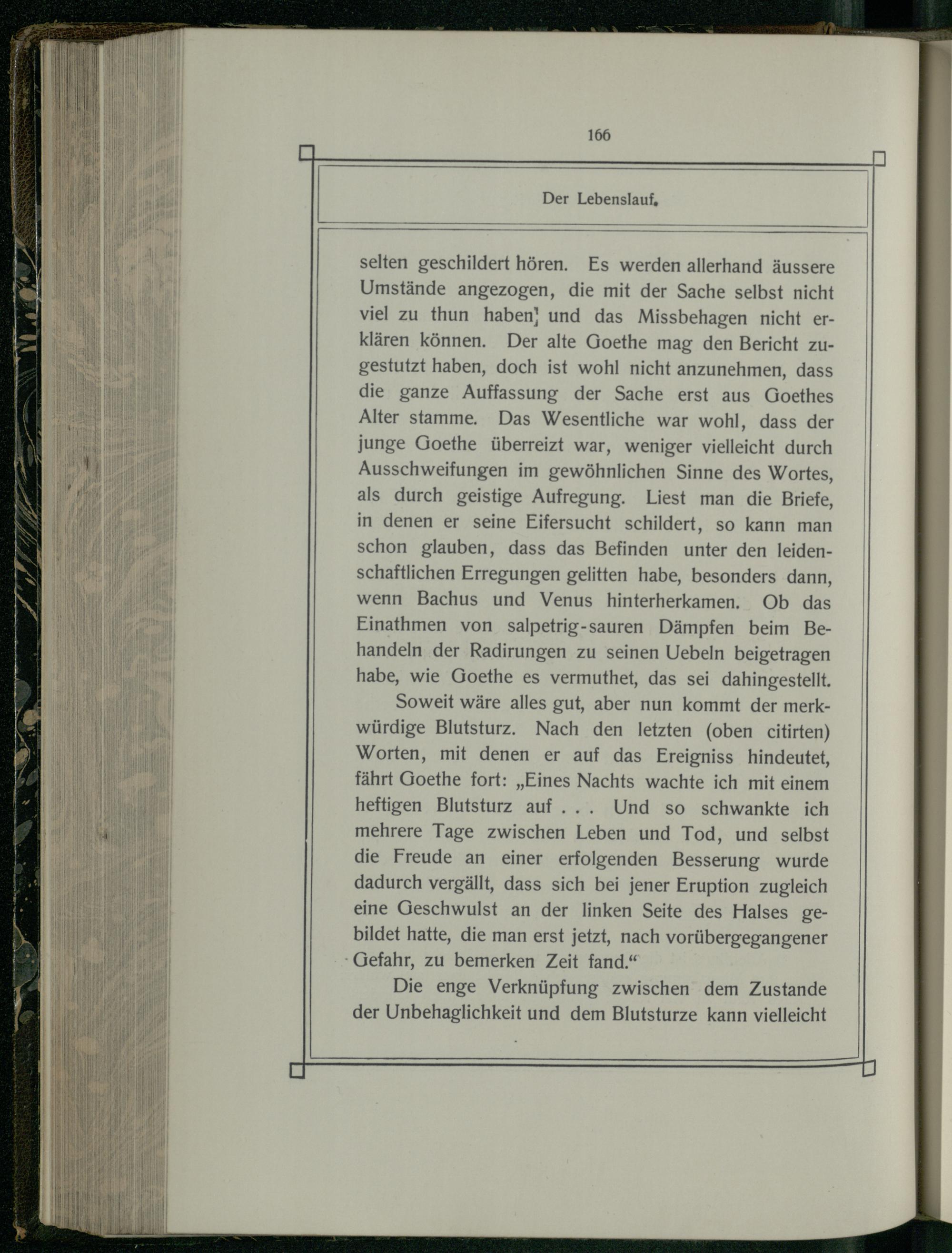 selten geschildert hören. Es werden allerhand äussere Umstände angezogen, die mit der Sache selbst nicht viel zu thun haben} und das Missbehagen nicht erklären können. Der alte Goethe mag den Bericht zugestutzt haben, doch ist wohl nicht anzunehmen, dass die ganze Auffassung der Sache erst aus Goethes Alter stamme. Das Wesentliche war wohl, dass der junge Goethe überreizt war, weniger vielleicht durch Ausschweifungen im gewöhnlichen Sinne des Wortes, als durch geistige Aufregung. Liest man die Briefe, in denen er seine Eifersucht schildert, so kann man schon glauben, dass das Befinden unter den leidenschaftlichen Erregungen gelitten habe, besonders dann, wenn Bachus und Venus hinterherkamen. Ob das Einathmen von salpetrig-sauren Dämpfen beim Behandeln der Radirungen zu seinen Uebeln beigetragen habe, wie Goethe es vermuthet, das sei dahingestellt,