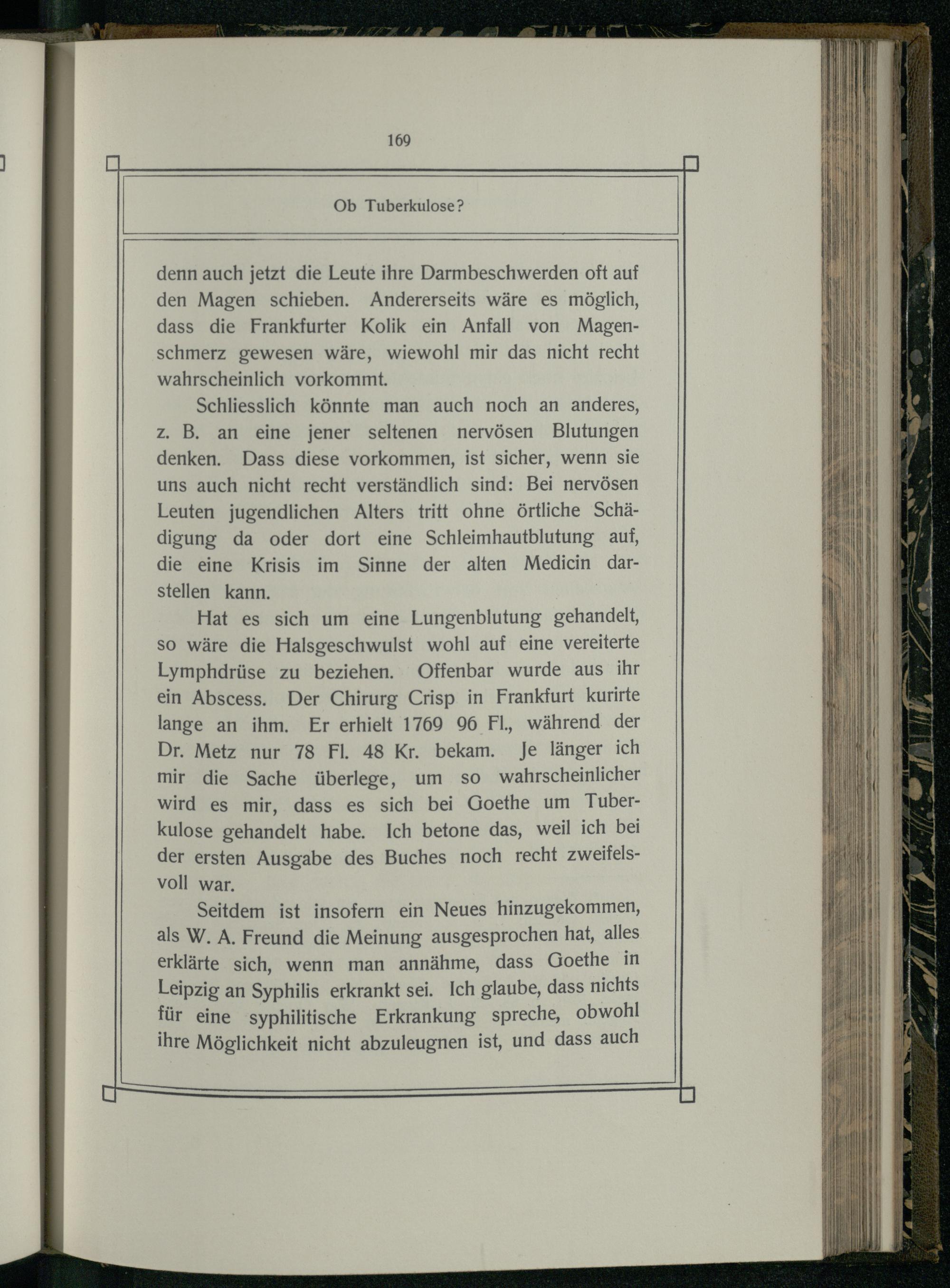 Hat es sich um eine Lungenblutung gehandelt, so wäre die Halsgeschwulst wohl auf eine vereiterte Lymphdrüse zu beziehen. Offenbar wurde aus ihr ein Abscess. Der Chirurg Crisp in Frankfurt kurirte lange an ihm. Er erhielt 1769 96 Fl, während. der Dr. Metz nur 78 Fl. 48 Kr. bekam. Je länger ich mir die Sache überlege, um so wahrscheinlicher wird es mir, dass es sich bei Goethe um Tuberkulose gehandelt habe. Ich betone das, weil ich bei der ersten Ausgabe des Buches noch recht zweifelsvoll war.
