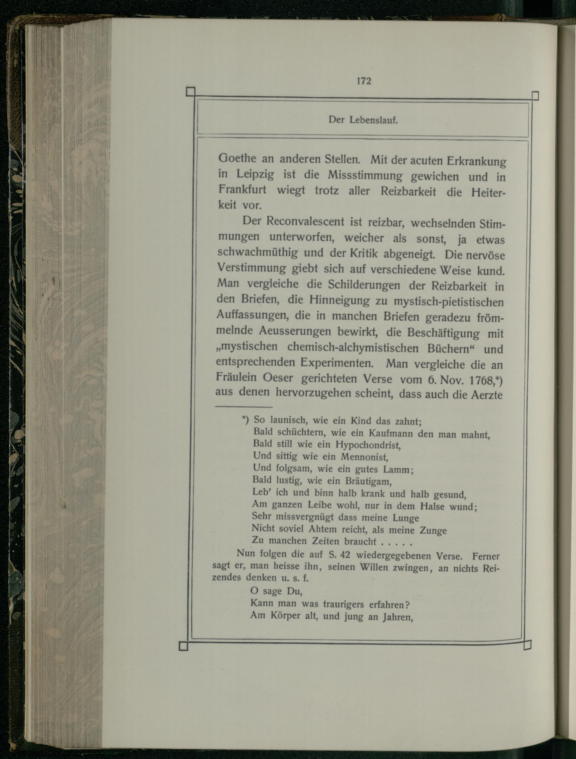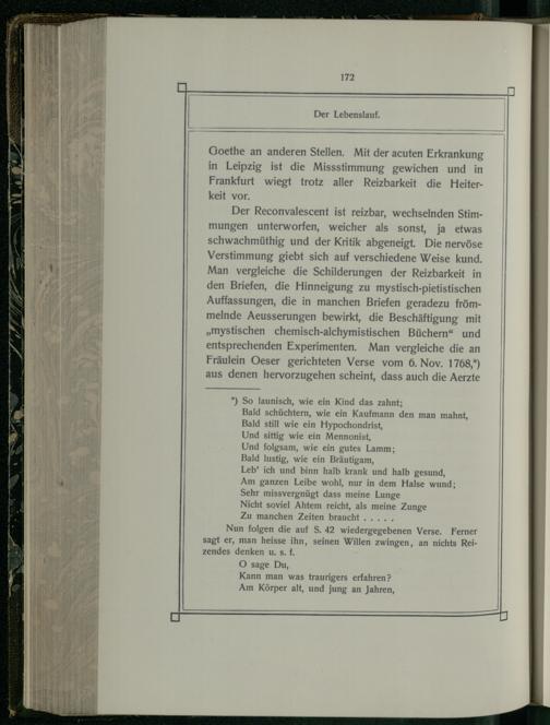 Der Reconvalescent ist reizbar, wechselnden Stimmungen unterworfen, weicher als sonst, ja etwas schwachmüthig und der Kritik abgeneigt. Die nervöse Verstimmung giebt sich auf verschiedene Weise kund. Man vergleiche die Schilderungen der Reizbarkeit in den Briefen, die Hinneigung zu mystisch-pietistischen Auffassungen, die in manchen Briefen geradezu frömmelnde Aeusserungen bewirkt, die Beschäftigung mit „mystischen chemisch-alchymistischen Büchern“ und entsprechenden Experimenten. Man vergleiche die an Fräulein Oeser gerichteten Verse vom 6. Nov. 1768,*) aus denen hervorzugehen scheint, dass auch die Aerzte