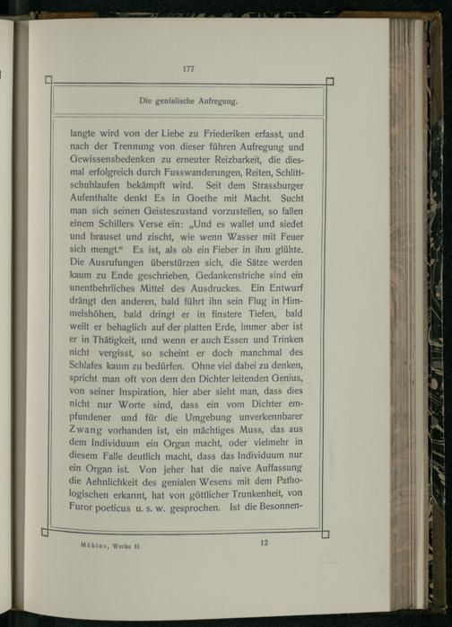 langte wird von der Liebe zu Friederiken erfasst, und nach der Trennung von dieser führen Aufregung und Gewissensbedenken zu erneuter Reizbarkeit, die diesmal erfolgreich durch Fusswanderungen, Reiten, Schlittschuhlaufen bekämpft wird. Seit dem Strassburger Aufenthalte denkt Es in Goethe mit Macht. Sucht man sich seinen Geisteszustand vorzustellen, so fallen einem Schillers Verse ein:„Und es wallet und siedet und brauset und zischt, wie wenn Wasser mit Feuer sich mengt.“ Es ist, als ob ein Fieber in ihm glühte. Die Ausrufungen überstürzen sich, die Sätze werden kaum zu Ende geschrieben, Gedankenstriche sind ein unentbehrliches Mittel des Ausdruckes. Ein Entwurf drängt den anderen, bald führt ihn sein Flug in Himmelshöhen, bald dringt er in finstere Tiefen, bald weilt er behaglich auf der platten Erde, immer aber ist er in Thätigkeit, und wenn er auch Essen und Trinken nicht vergisst, so scheint er doch manchmal des Schlafes kaum zu bedürfen. Ohne viel dabei zu denken, spricht man oft von dem den Dichter leitenden Genius, von seiner Inspiration, hier aber sieht man, dass dies nicht nur Worte sind, dass ein vom Dichter emPfundener und für die Umgebung unverkennbarer Zwang vorhanden ist, ein mächtiges Muss, das aus dem Individuum ein Organ macht, oder vielmehr in diesem Falle deutlich macht, dass das Individuum nur ein Organ ist. Von jeher hat die naive Auffassung die Aehnlichkeit des genialen Wesens mit dem Pathologischen erkannt, hat von göttlicher Trunkenheit, von Furor poeticus u. s. w. gesprochen. Ist die Besonnen