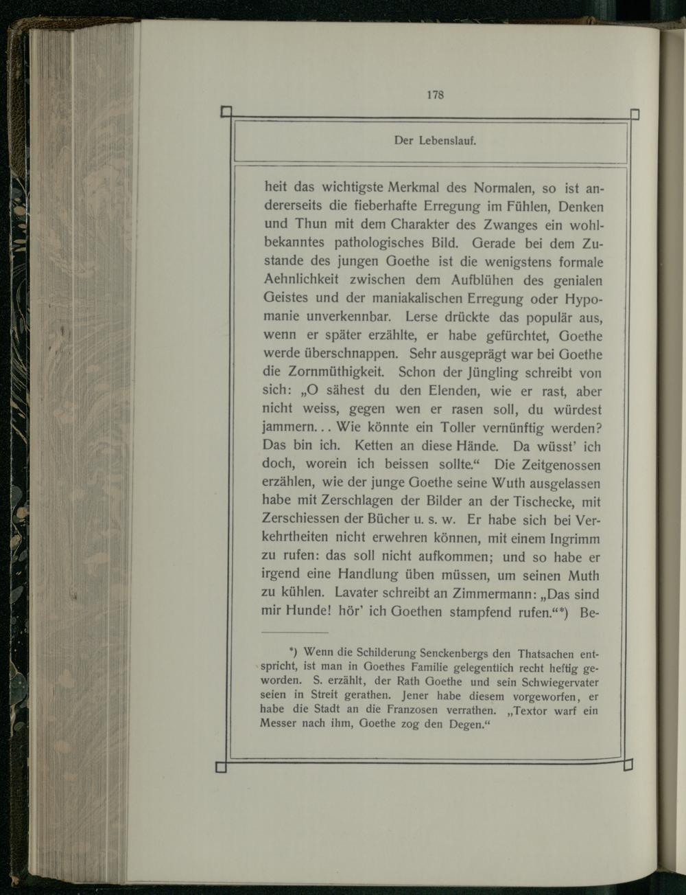 heit das wichtigste Merkmal des Normalen, so ist andererseits die fieberhafte Erregung im Fühlen, Denken und Thun mit dem Charakter des Zwanges ein wohlbekanntes pathologisches Bild. Gerade bei dem Zustande des jungen Goethe ist die wenigstens formale Aehnlichkeit zwischen dem Aufblühen des genialen Geistes und der maniakalischen Erregung oder Hypomanie unverkennbar. Lerse drückte das populär aus, wenn er später erzählte, er habe gefürchtet, Goethe werde überschnappen. Sehr ausgeprägt war bei Goethe die Zornmüthigkeit. Schon der Jüngling schreibt von sich:„O sähest du den Elenden, wie er rast, aber nicht weiss, gegen wen er rasen soll, du würdest jammern... Wie könnte ein Toller vernünftig werden? Das bin ich. Ketten an diese Hände. Da wüsst’ ich doch, worein ich beissen sollte“ Die Zeitgenossen erzählen, wie der junge Goethe seine Wuth ausgelassen habe mit Zerschlagen der Bilder an der Tischecke, mit Zerschiessen der Bücher u. s. w. Er habe sich bei Verkehrtheiten nicht erwehren können, mit einem Ingrimm zu rufen: das soll nicht aufkommen; und so habe er irgend eine Handlung üben müssen, um seinen Muth zu kühlen. Lavater schreibt an Zimmermann:„Das sind mir Hunde! hör’ ich Goethen stampfend rufen.“*) Be
