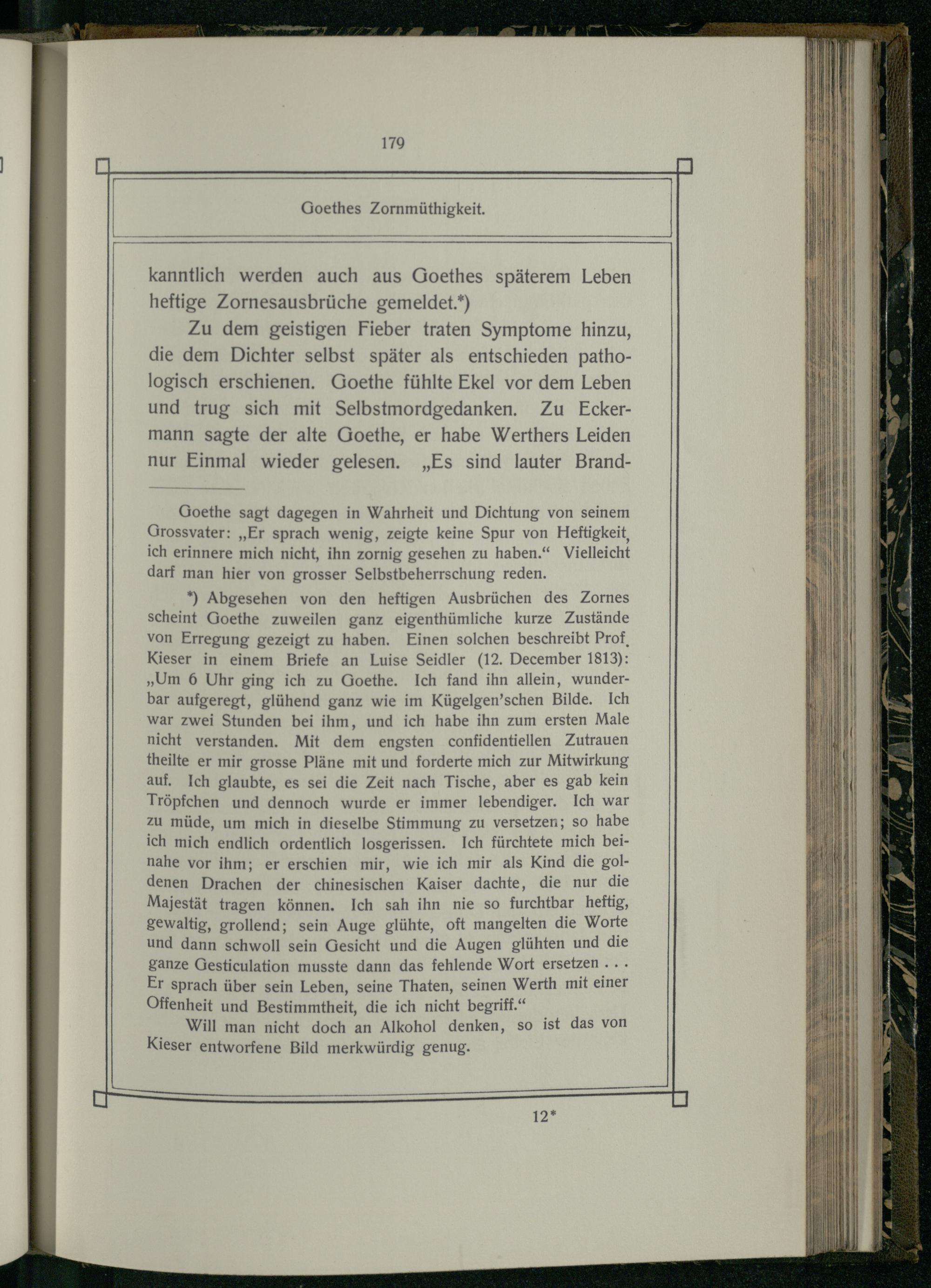 *) Abgesehen von den heftigen Ausbrüchen des Zornes scheint Goethe zuweilen ganz eigenthümliche kurze Zustände von Erregung gezeigt zu haben. Einen solchen beschreibt Prof, Kieser in einem Briefe an Luise Seidler(12. December 1813): „Um 6 Uhr ging ich zu Goethe. Ich fand ihn allein, wunderbar aufgeregt, glühend ganz wie im Kügelgen’schen Bilde. Ich war zwei Stunden bei ihm, und ich habe ihn zum ersten Male nicht verstanden. Mit dem engsten confidentiellen Zutrauen theilte er mir grosse Pläne mit und forderte mich zur Mitwirkung auf, Ich glaubte, es sei die Zeit nach Tische, aber es gab kein Tröpfchen und dennoch wurde er immer lebendiger. Ich war zu müde, um mich in dieselbe Stimmung zu versetzen; so habe ich mich endlich ordentlich losgerissen. Ich fürchtete mich beinahe vor ihm; er erschien mir, wie ich mir als Kind die goldenen Drachen der chinesischen Kaiser dachte, die nur die Majestät tragen können. Ich sah ihn nie so furchtbar heftig, gewaltig, grollend; sein Auge glühte, oft mangelten die Worte und dann schwoll sein Gesicht und die Augen glühten und die ganze Gesticulation musste dann das fehlende Wort ersetzen... Er sprach über sein Leben, seine Thaten, seinen Werth mit einer Offenheit und Bestimmtheit, die ich nicht begriff.“