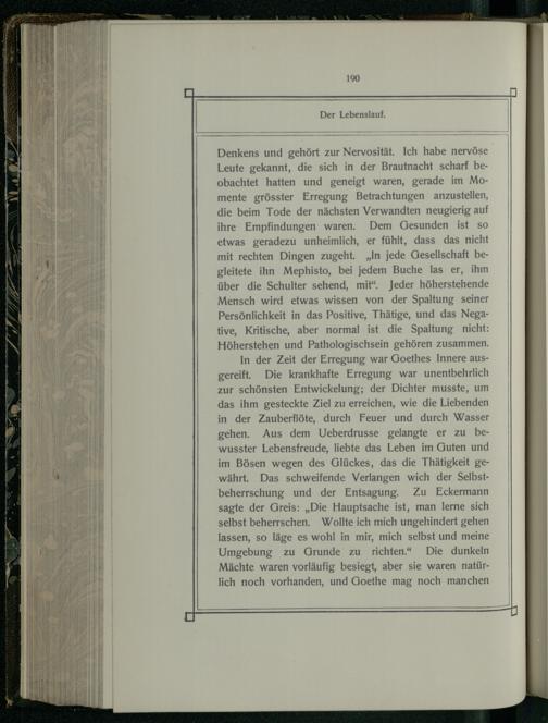 In der Zeit der Erregung war Goethes Innere ausgereift. Die krankhafte Erregung war unentbehrlich zur schönsten Entwickelung; der Dichter musste, um das ihm gesteckte Ziel zu erreichen, wie die Liebenden in der Zauberflöte, durch Feuer und durch Wasser gehen. Aus dem Ueberdrusse gelangte er zu bewusster Lebensfreude, liebte das Leben im Guten und im Bösen wegen des Glückes, das die Thätigkeit gewährt. Das schweifende Verlangen wich der Selbstbeherrschung und der Entsagung. Zu Eckermann sagte der Greis:„Die Hauptsache ist, man lerne sich selbst beherrschen. Wollte ich mich ungehindert gehen lassen, so läge es wohl in mir, mich selbst und meine Umgebung zu Grunde zu richten.“ Die dunkeln Mächte waren vorläufig besiegt, aber sie waren natürlich noch vorhanden, und Goethe mag noch manchen