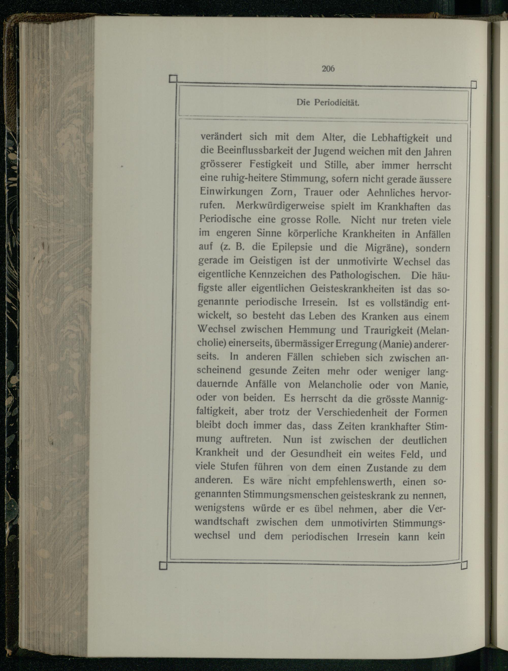 verändert sich mit dem Alter, die Lebhaftigkeit und die Beeinflussbarkeit der Jugend weichen mit den Jahren grösserer Festigkeit und Stille, aber immer herrscht eine ruhig-heitere Stimmung, sofern nicht gerade äussere Einwirkungen Zorn, Trauer oder Aehnliches hervorrufen. Merkwürdigerweise spielt im Krankhaften das Periodische eine grosse Rolle. Nicht nur treten viele im engeren Sinne körperliche Krankheiten in Anfällen auf(z. B. die Epilepsie und die Migräne), sondern gerade im Geistigen ist der unmotivirte Wechsel das eigentliche Kennzeichen des Pathologischen. Die häufigste aller eigentlichen Geisteskrankheiten ist das sogenannte periodische Irresein. Ist es vollständig entwickelt, so besteht das Leben des Kranken aus einem Wechsel zwischen Hemmung und Traurigkeit(Melancholie) einerseits, übermässiger Erregung(Manie) andererseits. In anderen Fällen schieben sich zwischen anscheinend gesunde Zeiten mehr oder weniger langdauernde Anfälle von Melancholie oder von Manie, oder von beiden. Es herrscht da die grösste Mannigfaltigkeit, aber trotz der Verschiedenheit der Formen bleibt doch immer das, dass Zeiten krankhafter Stimmung auftreten. Nun ist zwischen der deutlichen Krankheit und der Gesundheit ein weites Feld, und viele Stufen führen von dem einen Zustande zu dem anderen. Es wäre nicht empfehlenswerth, einen sOogenannten Stimmungsmenschen geisteskrank zu nennen, wenigstens würde er es übel nehmen, aber die Verwandtschaft zwischen dem unmotivirten Stimmungswechsel und dem periodischen Irresein kann kein
