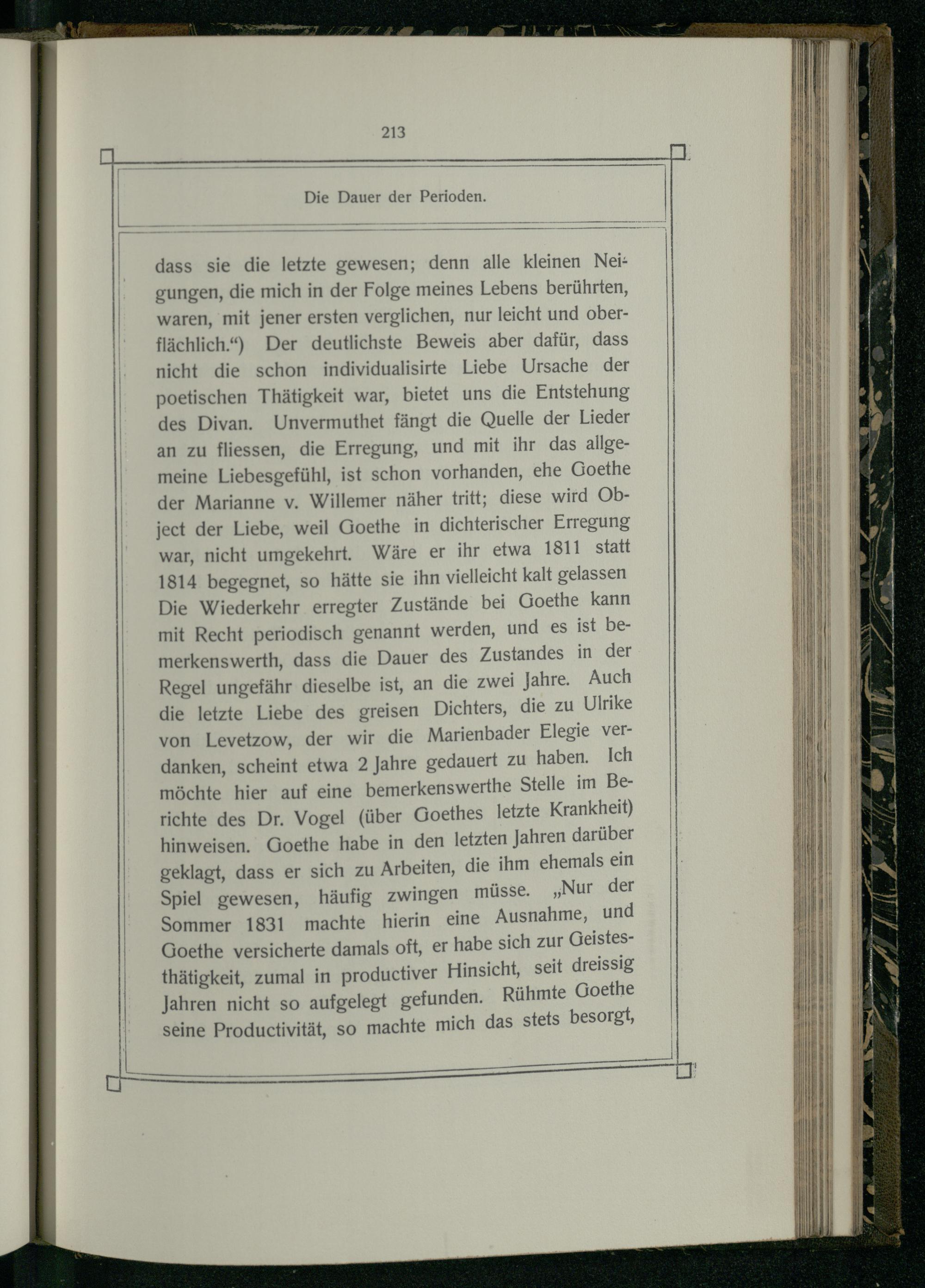 dass sie die letzte gewesen; denn alle kleinen Nei+ gungen, die mich in der Folge meines Lebens berührten, waren, mit jener ersten verglichen, nur leicht und oberflächlich.“) Der deutlichste Beweis aber dafür, dass nicht die schon individualisirte Liebe Ursache der poetischen Thätigkeit war, bietet uns die Entstehung des Divan. Unvermuthet fängt die Quelle der Lieder an zu fliessen, die Erregung, und mit ihr das allgemeine Liebesgefühl, ist schon vorhanden, ehe Goethe der Marianne v. Willemer näher tritt; diese wird Object der Liebe, weil Goethe in dichterischer Erregung war, nicht umgekehrt. Wäre er ihr etwa 1811 statt 1814 begegnet, so hätte sie ihn vielleicht kalt gelassen Die Wiederkehr erregter Zustände bei Goethe kann mit Recht periodisch genannt werden, und es ist bemerkenswerth, dass die Dauer des Zustandes in der Regel ungefähr dieselbe ist, an die zwei Jahre. Auch die letzte Liebe des greisen Dichters, die zu Ulrike von Levetzow, der wir die Marienbader Elegie verdanken, scheint etwa 2 Jahre gedauert zu haben. Ich möchte hier auf eine bemerkenswerthe Stelle im Berichte des Dr. Vogel(über Goethes letzte Krankheit) hinweisen. Goethe habe in den letzten Jahren darüber geklagt, dass er sich zu Arbeiten, die ihm ehemals ein Spiel gewesen, häufig zwingen müsse.„Nur der Sommer 1831 machte hierin eine Ausnahme, und Goethe versicherte damals oft, er habe sich zur Geistesthätigkeit, zumal in productiver Hinsicht, seit dreissig Jahren nicht so aufgelegt gefunden. Rühmte Goethe seine Productivität, so machte mich das stets besorgt,