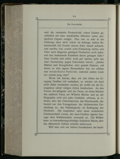 weil die vermehrte Productivität seines Geistes gewöhnlich mit einer krankhaften Affection seiner productiven Organe endigte. Dies war so sehr in der Ordnung, dass mich schon im Anfange meiner Bekanntschaft mit Goethe dessen Sohn darauf aufmerksam machte, wie, soweit seine Erinnerung reiche, sein Vater nach längerem geistigen Produciren noch jedesmal eine bedeutende Krankheit davon getragen habe.“ Dass Goethe sich selbst recht gut kannte, geht aus einer Aeusserung gegen Eckermann hervor:„Solche Männer und ihresgleichen sind geniale Naturen, mit denen es eine eigene Bewandtniss hat; sie erleben eine wiederholte Pubertät, wahrend andere Leute nur einmal jung sind.“