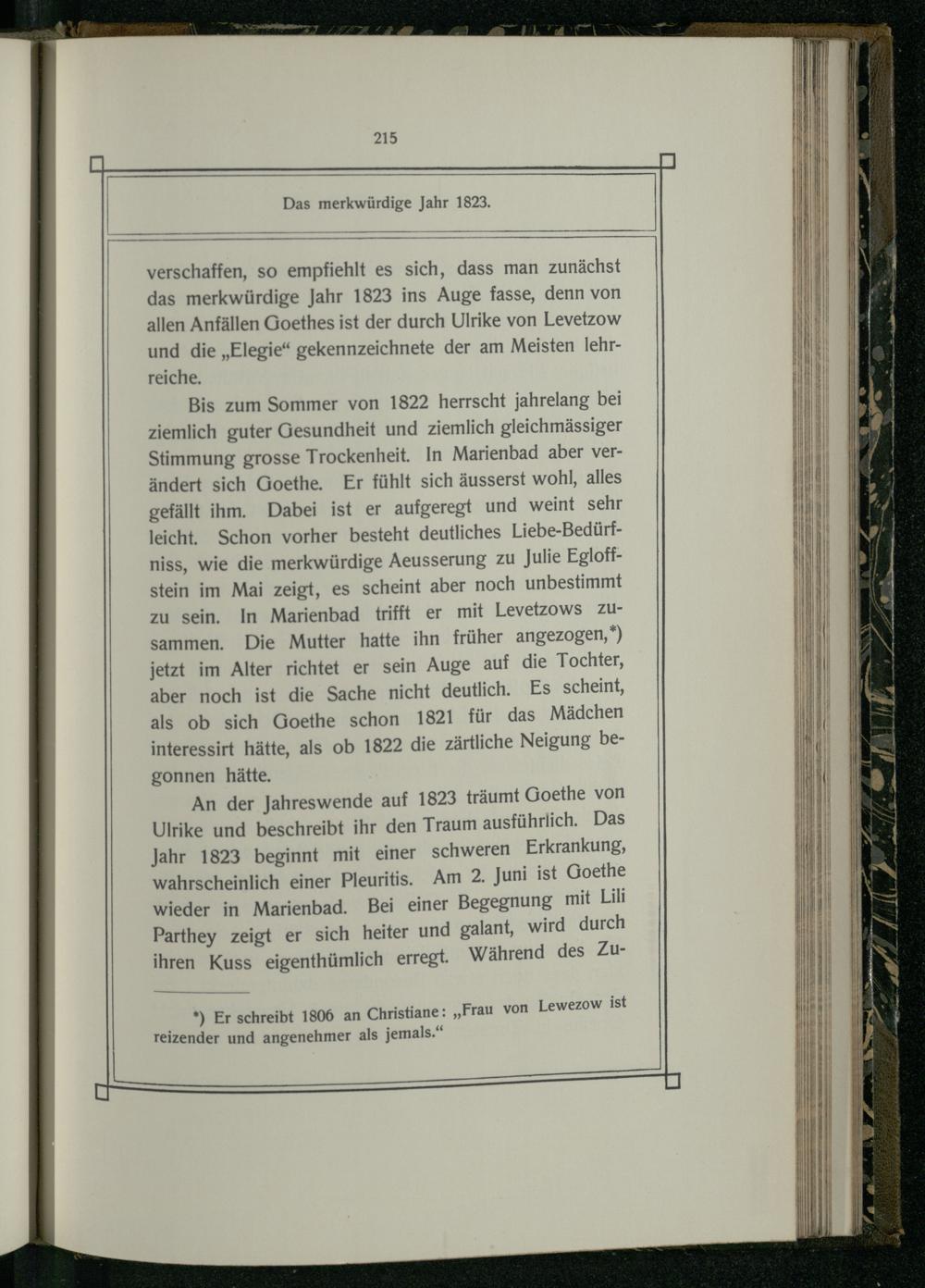 Bis zum Sommer von 1822 herrscht jahrelang bei ziemlich guter Gesundheit und ziemlich gleichmässiger Stimmung grosse Trockenheit. In Marienbad aber verändert sich Goethe. Er fühlt sich äusserst wohl, alles gefällt ihm. Dabei ist er aufgeregt und weint sehr leicht. Schon vorher besteht deutliches Liebe-Bedürfniss, wie die merkwürdige Aeusserung zu Julie Egloffstein im Mai zeigt, es scheint aber noch unbestimmt zu sein. In Marienbad trifft er mit Levetzows ZUsammen. Die Mutter hatte ihn früher angezogen,*) jetzt im Alter richtet er sein Auge auf die Tochter, aber noch ist die Sache nicht deutlich. Es scheint, als ob sich Goethe schon 1821 für das Mädchen interessirt hätte, als ob 1822 die zärtliche Neigung begonnen hätte.