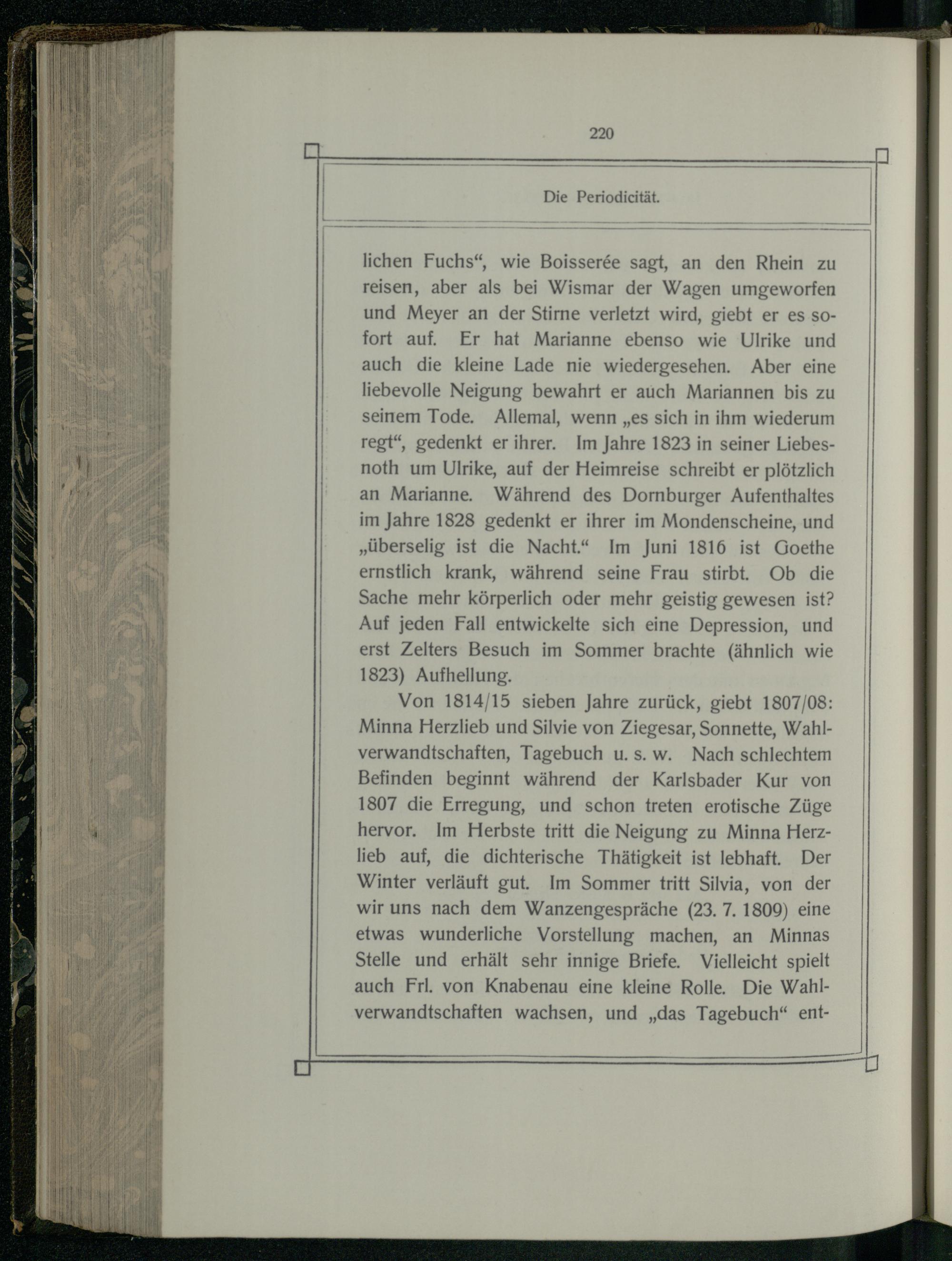 Von 1814/15 sieben Jahre zurück, giebt 1807/08: Minna Herzlieb und Silvie von Ziegesar, Sonnette, Wahlverwandtschaften, Tagebuch u.s. w. Nach schlechtem Befinden beginnt während der Karlsbader Kur von 1807 die Erregung, und schon treten erotische Züge hervor. Im Herbste tritt die Neigung zu Minna Herzlieb auf, die dichterische Thätigkeit ist lebhaft. Der Winter verläuft gut. Im Sommer tritt Silvia, von der wir uns nach dem Wanzengespräche(23. 7. 1809) eine etwas wunderliche Vorstellung machen, an Minnas Stelle und erhält sehr innige Briefe. Vielleicht spielt auch Frl. von Knabenau eine kleine Rolle. Die Wahlverwandtschaften wachsen, und„das Tagebuch“ ent