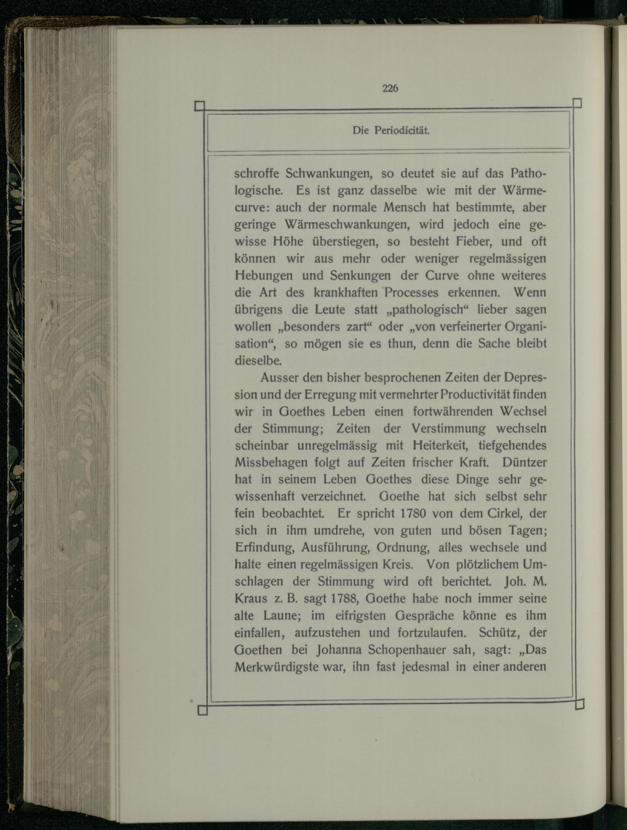 Ausser den bisher besprochenen Zeiten der Depression und der Erregung mit vermehrter Productivität finden wir in Goethes Leben einen fortwährenden Wechsel der Stimmung; Zeiten der Verstimmung wechseln scheinbar unregelmässig mit Heiterkeit, tiefgehendes Missbehagen folgt auf Zeiten frischer Kraft. Düntzer hat in seinem Leben Goethes diese Dinge sehr gewissenhaft verzeichnet. Goethe hat sich selbst sehr fein beobachtet. Er spricht 1780 von dem Cirkel, der sich in ihm umdrehe, von guten und bösen Tagen; Erfindung, Ausführung, Ordnung, alles wechsele und halte einen regelmässigen Kreis. Von plötzlichem Umschlagen der Stimmung wird oft berichtet. Joh. M. Kraus z.B. sagt 1788, Goethe habe noch immer seine alte Laune; im eifrigsten Gespräche könne es ihm einfallen, aufzustehen und fortzulaufen. Schütz, der Goethen bei Johanna Schopenhauer sah, sagt:„Das Merkwürdigste war, ihn fast jedesmal in einer anderen