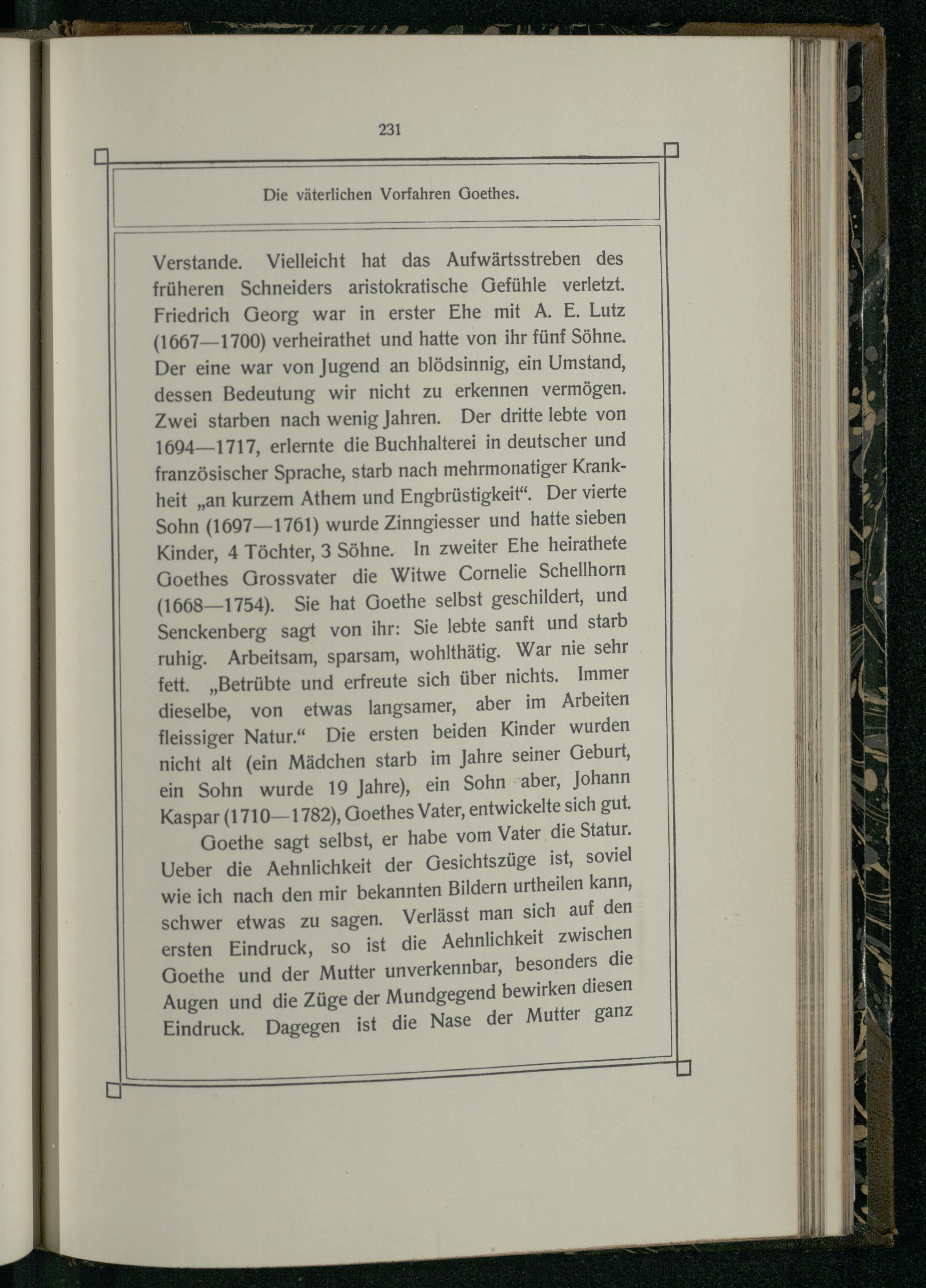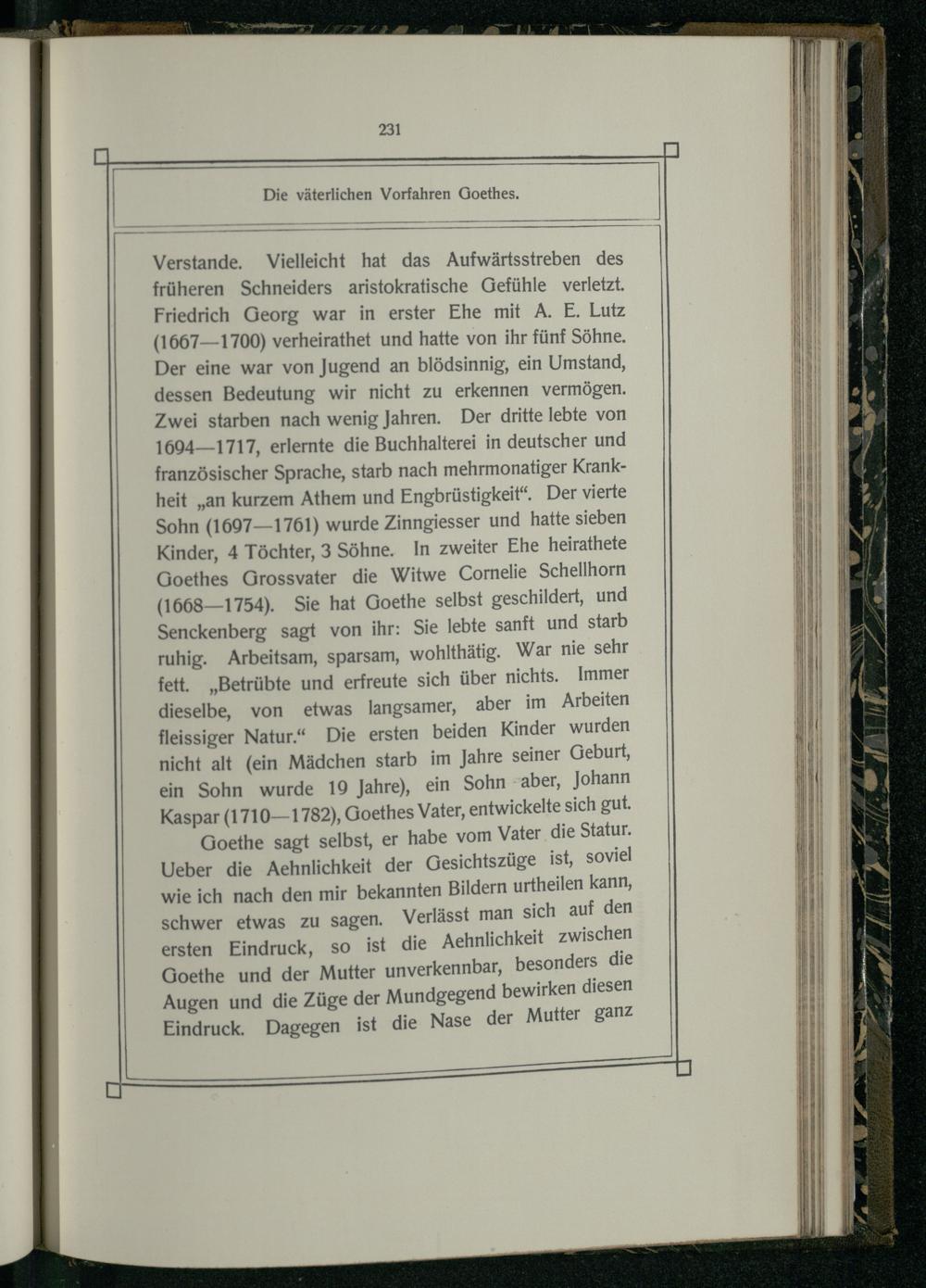 Verstande. Vielleicht hat das Aufwärtsstreben des früheren Schneiders aristokratische Gefühle verletzt. Friedrich Georg war in erster Ehe mit A. E. Lutz (1667—1700) verheirathet und hatte von ihr fünf Söhne. Der eine war von Jugend an blödsinnig, ein Umstand, dessen Bedeutung wir nicht zu erkennen vermögen. Zwei starben nach wenig Jahren. Der dritte lebte von 1694—1717, erlernte die Buchhalterei in deutscher und französischer Sprache, starb nach mehrmonatiger Krankheit„an kurzem Athem und Engbrüstigkeit“. Der vierte Sohn(1697—1761) wurde Zinngiesser und hatte sieben Kinder, 4 Töchter, 3 Söhne. In zweiter Ehe heirathete Goethes Grossvater die Witwe Cornelie Schellhorn (1668—1754). Sie hat Goethe selbst geschildert, und Senckenberg sagt von ihr: Sie lebte sanft und starb ruhig. Arbeitsam, sparsam, wohlthätig. War nie sehr fett.„Betrübte und erfreute sich über nichts. Immer dieselbe, von etwas langsamer, aber im Arbeiten fleissiger Natur.“ Die ersten beiden Kinder wurden nicht alt(ein Mädchen starb im Jahre seiner Geburt, ein Sohn wurde 19 Jahre), ein Sohn“aber, Johann Kaspar(1710—1782), Goethes Vater, entwickelte sich gut.