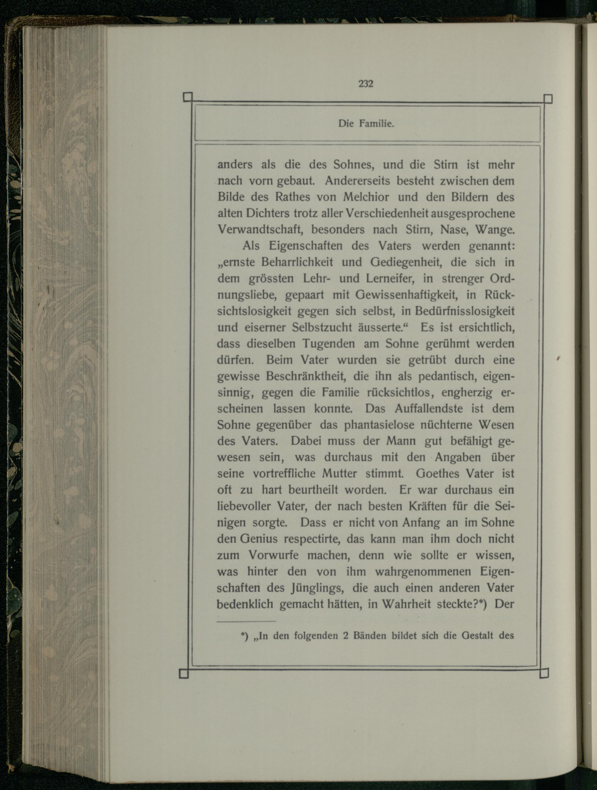 scheinen lassen konnte. Das Auffallendste ist dem Sohne gegenüber das phantasielose nüchterne Wesen des Vaters. Dabei muss der Mann gut befähigt gewesen sein, was durchaus mit den Angaben über seine vortreffliche Mutter stimmt. Goethes Vater ist oft zu hart beurtheilt worden. Er war durchaus ein liebevoller Vater, der nach besten Kräften für die Seinigen sorgte. Dass er nicht von Anfang an im Sohne den Genius respectirte, das kann man ihm doch nicht zum Vorwurfe machen, denn wie sollte er wissen, was hinter den von ihm wahrgenommenen Eigenschaften des Jünglings, die auch einen anderen Vater bedenklich gemacht hätten, in Wahrheit steckte?*) Der