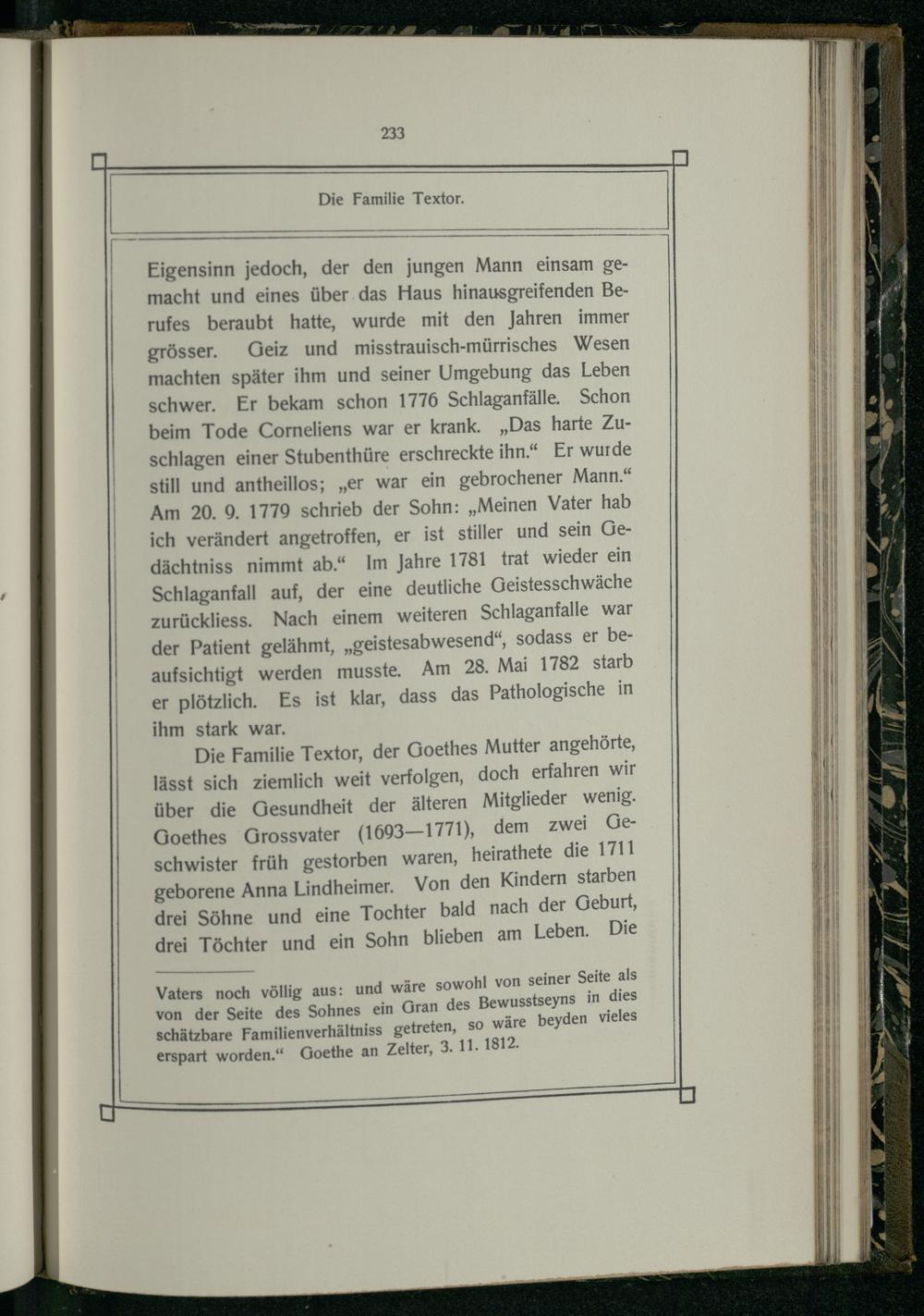 Die Familie Textor, der Goethes Mutter angehörte, lässt sich ziemlich weit verfolgen, doch erfahren wir über die Gesundheit der älteren Mitglieder wenig. Goethes Grossvater(1693—1771), dem zwei Geschwister früh gestorben waren, heirathete die 1711 geborene Anna Lindheimer. Von den Kindern starben drei Söhne und eine Tochter bald nach der Geburt, drei Töchter und ein Sohn blieben am Leben. Die