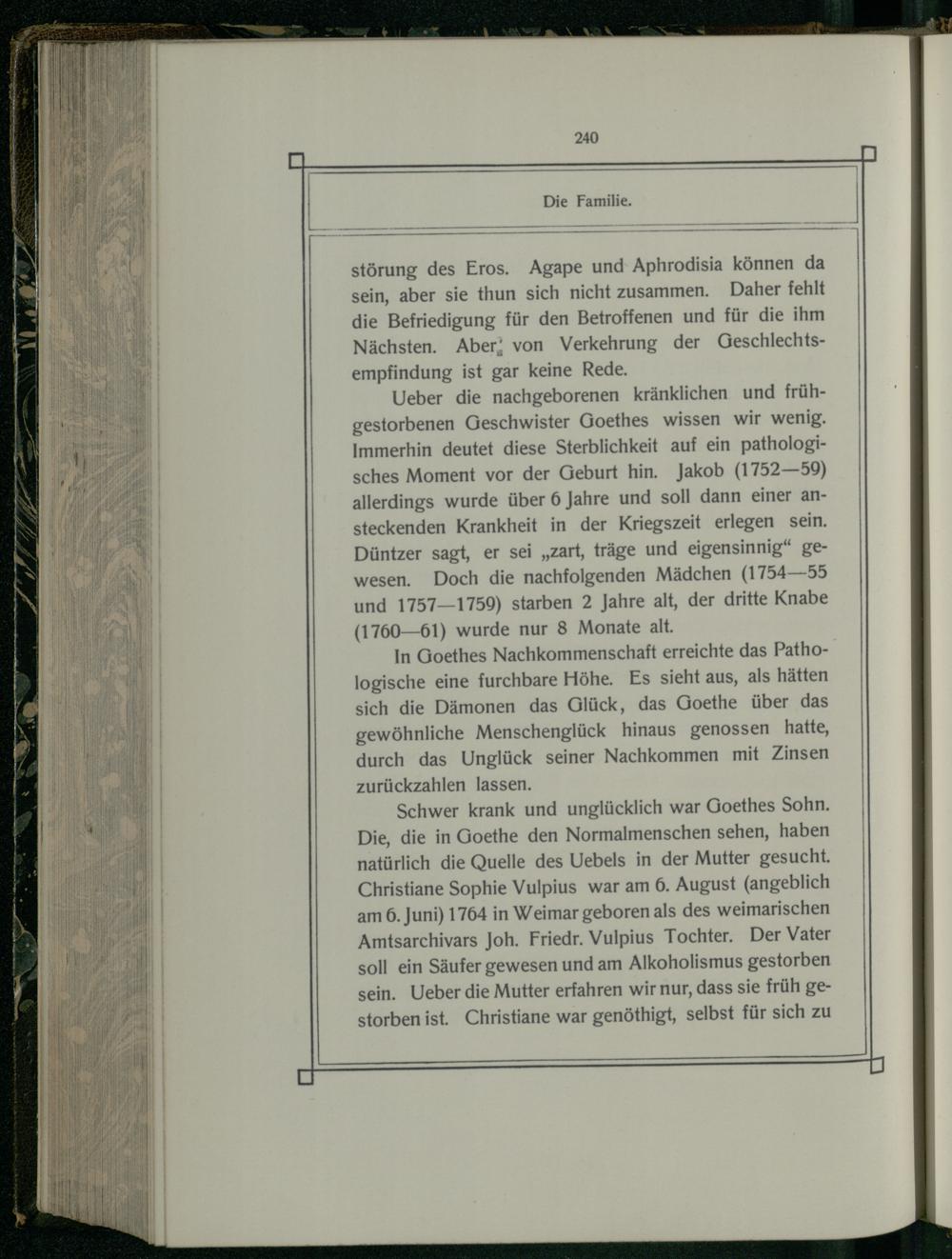 Schwer krank und unglücklich war Goethes Sohn. Die, die in Goethe den Normalmenschen sehen, haben natürlich die Quelle des Uebels in der Mutter gesucht. Christiane Sophie Vulpius war am 6. August(angeblich am 6. Juni) 1764 in Weimar geboren als des weimarischen Amtsarchivars Joh. Friedr. Vulpius Tochter, Der Vater soll ein Säufer gewesen und am Alkoholismus gestorben sein. Ueber die Mutter erfahren wir nur, dass sie früh gestorben ist. Christiane war genöthigt, selbst für sich zu
