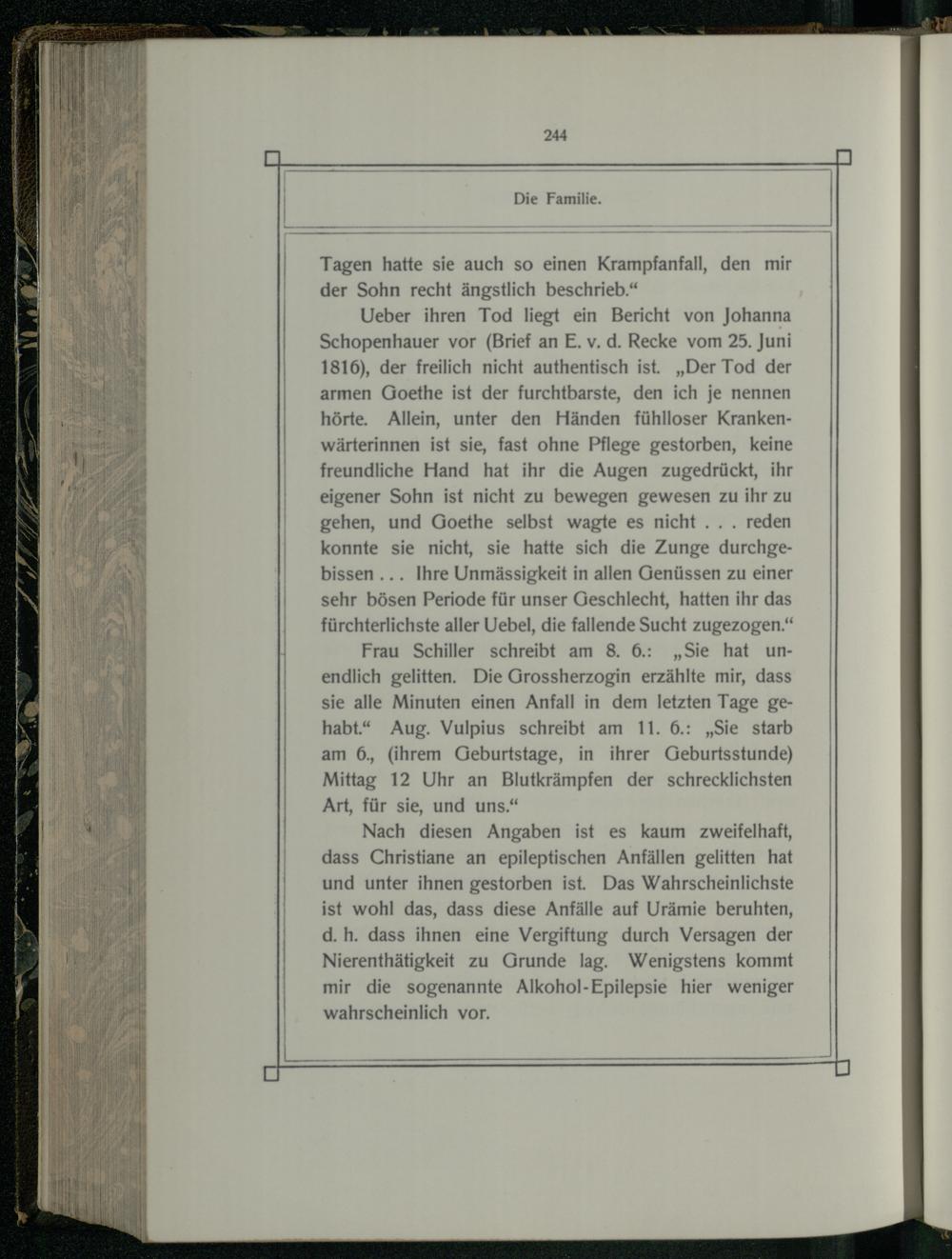 Frau Schiller schreibt am 8. 6.:„Sie hat unendlich gelitten. Die Grossherzogin erzählte mir, dass sie alle Minuten einen Anfall in dem letzten Tage gehabt.“ Aug. Vulpius schreibt am 11. 6.:„Sie starb am 6.,(ihrem Geburtstage, in ihrer Geburtsstunde) Mittag 12 Uhr an Blutkrämpfen der schrecklichsten Art, für sie, und uns.“
