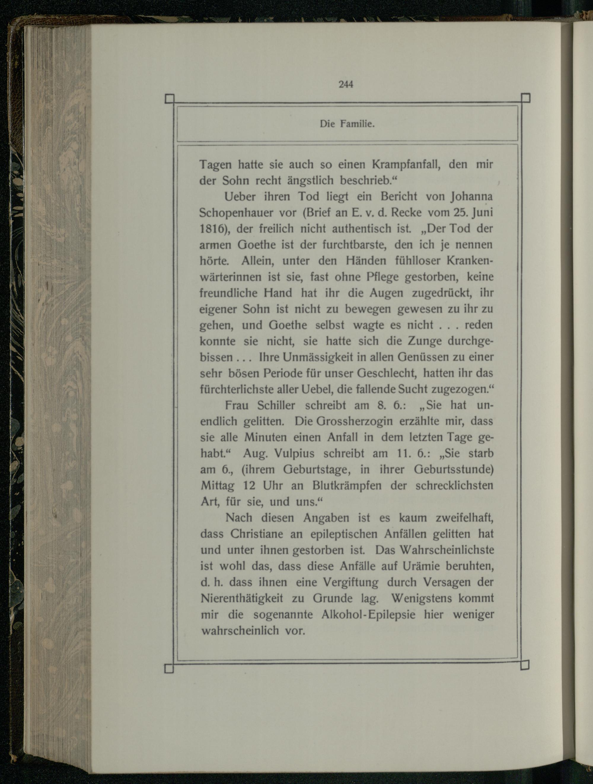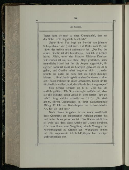 Nach diesen Angaben ist es kaum zweifelhaft, dass Christiane an epileptischen Anfällen gelitten hat und unter ihnen gestorben ist. Das Wahrscheinlichste ist wohl das, dass diese Anfälle auf Urämie beruhten, d. h. dass ihnen eine Vergiftung durch Versagen der Nierenthätigkeit zu Grunde lag. Wenigstens kommt mir die sogenannte Alkohol-Epilepsie hier weniger wahrscheinlich vor.