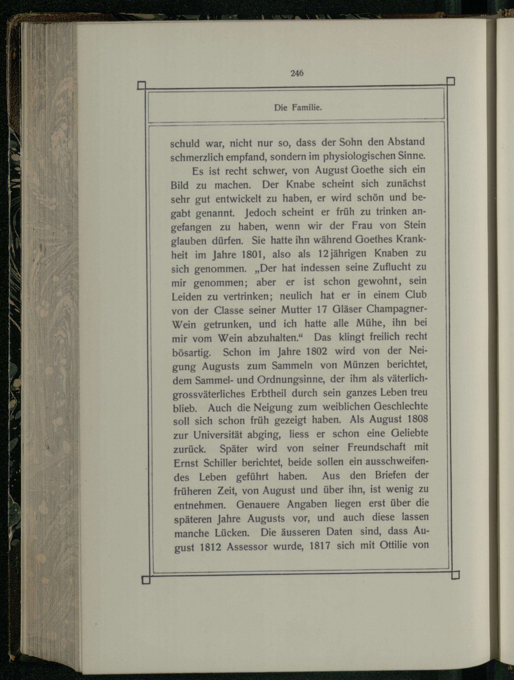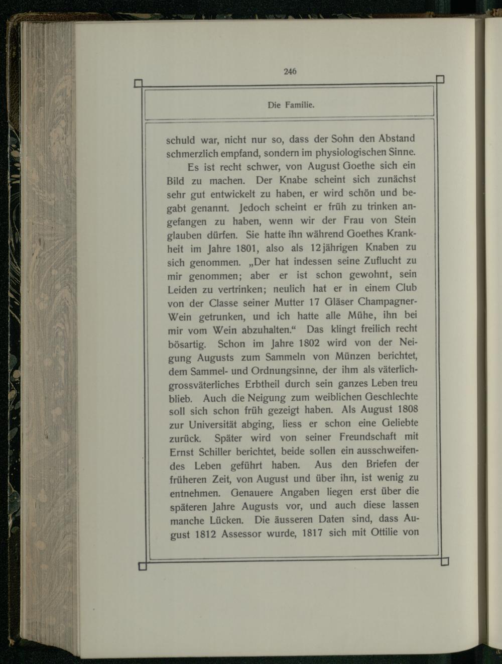 Es ist recht schwer, von August Goethe sich ein Bild zu machen. Der Knabe scheint sich zunächst sehr gut entwickelt zu haben, er wird schön und begabt genannt. Jedoch scheint er früh zu trinken angefangen zu haben, wenn wir der Frau von Stein glauben dürfen. Sie hatte ihn während Goethes Krankheit im Jahre 1801, also als 12jährigen Knaben zu sich genommen.„Der hat indessen seine Zuflucht zu mir genommen; aber er ist schon gewohnt, sein Leiden zu vertrinken; neulich hat er in einem Club von der Classe seiner Mutter 17 Gläser ChampagnerWein getrunken, und ich hatte alle Mühe, ihn bei mir vom Wein abzuhalten.“ Das klingt freilich recht bösartig. Schon im Jahre 1802 wird von der Neigung Augusts zum Sammeln von Münzen berichtet, dem Sammel- und Ordnungsinne, der ihm als väterlichgrossväterliches Erbtheil durch sein ganzes Leben treu blieb. Auch die Neigung zum weiblichen Geschlechte soll sich schon früh gezeigt haben. Als August 1808 zur Universität abging, liess er schon eine Geliebte zurück. Später wird von seiner Freundschaft mit Ernst Schiller berichtet, beide sollen ein ausschweifendes Leben geführt haben. Aus den Briefen der früheren Zeit, von August und über ihn, ist wenig zu entnehmen. Genauere Angaben liegen erst über die späteren Jahre Augusts vor, und auch diese lassen manche Lücken. Die äusseren Daten sind, dass August 1812 Assessor wurde, 1817 sich mit Ottilie von