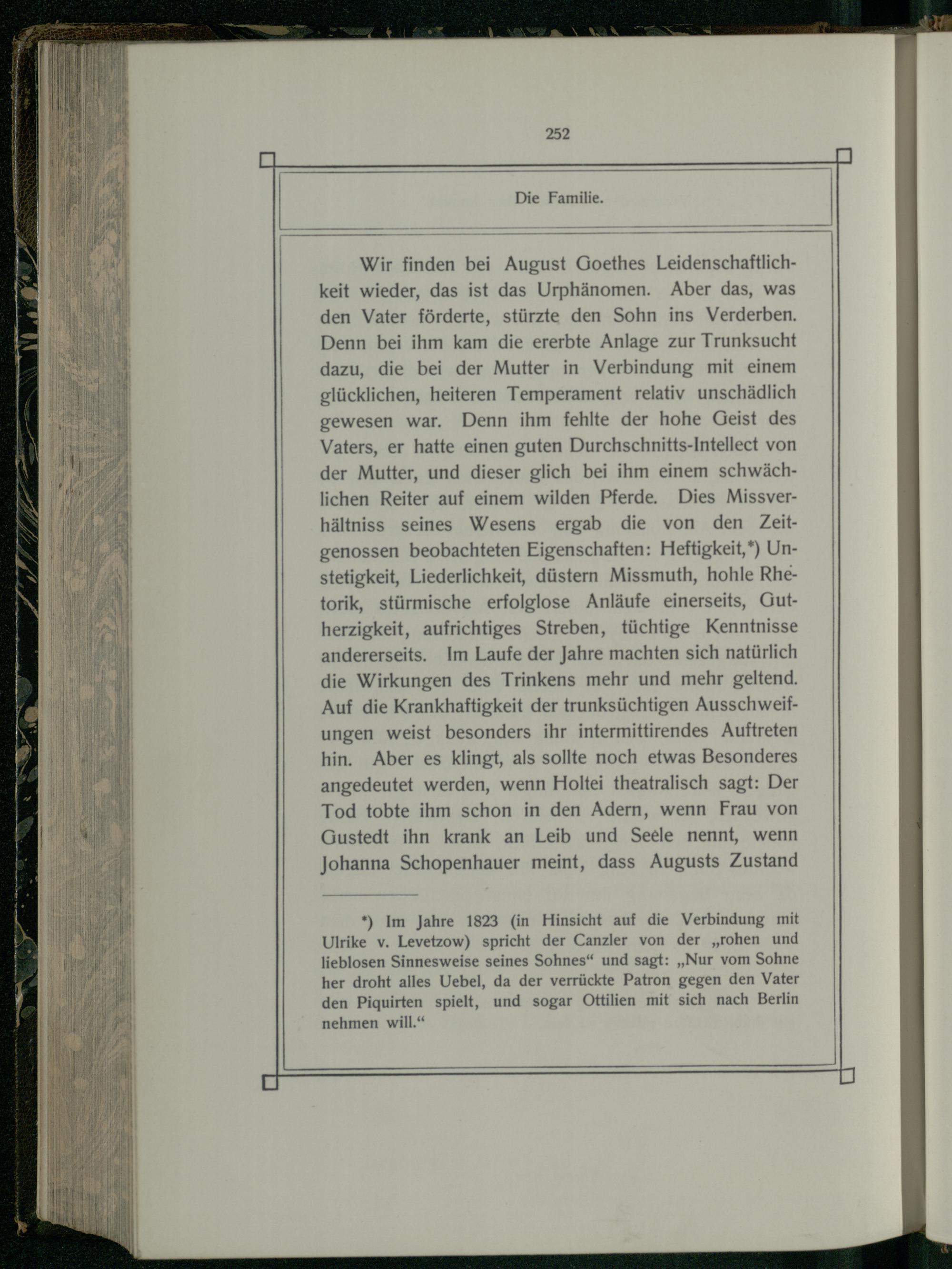 Wir finden bei August Goethes Leidenschaftlichkeit wieder, das ist das Urphänomen. Aber das, was den Vater förderte, stürzte den Sohn ins Verderben, Denn bei ihm kam die ererbte Anlage zur Trunksucht dazu, die bei der Mutter in Verbindung mit einem glücklichen, heiteren Temperament relativ unschädlich gewesen war. Denn ihm fehlte der hohe Geist des Vaters, er hatte einen guten Durchschnitts-Intellect von der Mutter, und dieser glich bei ihm einem schwächlichen Reiter auf einem wilden Pferde. Dies Missverhältniss seines Wesens ergab die von den Zeitgenossen beobachteten Eigenschaften: Heftigkeit,*) Unstetigkeit, Liederlichkeit, düstern Missmuth, hohle Rhetorik, stürmische erfolglose Anläufe einerseits, Gutherzigkeit, aufrichtiges Streben, tüchtige Kenntnisse andererseits. Im Laufe der Jahre machten sich natürlich die Wirkungen des Trinkens mehr und mehr geltend. Auf die Krankhaftigkeit der trunksüchtigen Ausschweifungen weist besonders ihr intermittirendes Auftreten hin. Aber es klingt, als sollte noch etwas Besonderes angedeutet werden, wenn Holtei theatralisch sagt: Der Tod tobte ihm schon in den Adern, wenn Frau von Gustedt ihn krank an Leib und Seele nennt, wenn Johanna Schopenhauer meint, dass Augusts Zustand