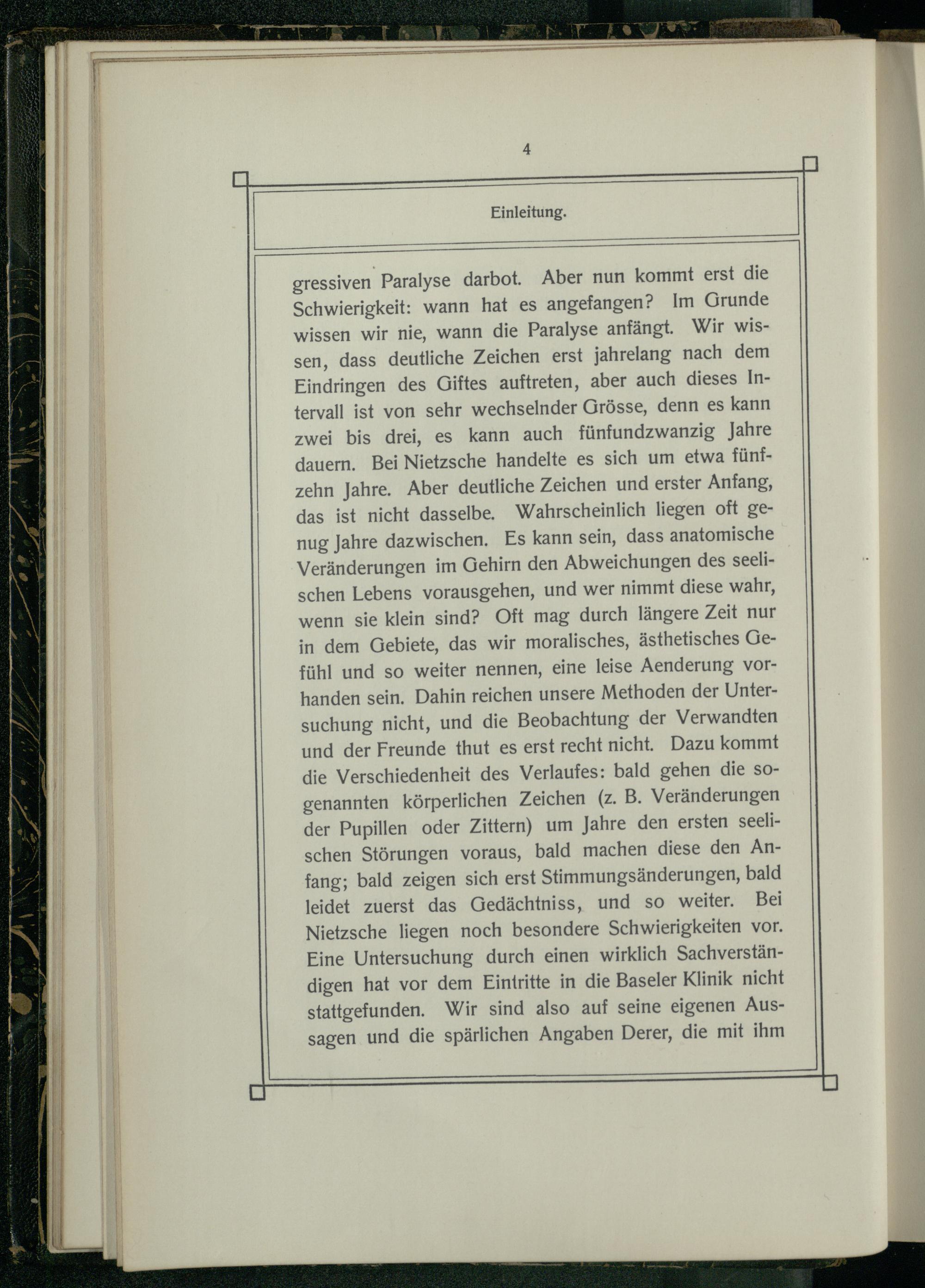 gressiven Paralyse darbot. Aber nun kommt erst die Schwierigkeit: wann hat es angefangen? Im Grunde wissen wir nie, wann die Paralyse anfängt. Wir wissen, dass deutliche Zeichen erst jahrelang nach dem Eindringen des Giftes auftreten, aber auch dieses Intervall ist von sehr wechselnder Grösse, denn es kann zwei bis drei, es kann auch fünfundzwanzig Jahre dauern. Bei Nietzsche handelte es sich um etwa fünfzehn Jahre. Aber deutliche Zeichen und erster Anfang, das ist nicht dasselbe. Wahrscheinlich liegen oft genug Jahre dazwischen. Es kann sein, dass anatomische Veränderungen im Gehirn den Abweichungen des seelischen Lebens vorausgehen, und wer nimmt diese wahr, wenn sie klein sind? Oft mag durch längere Zeit nur in dem Gebiete, das wir moralisches, ästhetisches Gefühl und so weiter nennen, eine leise Aenderung vorhanden sein. Dahin reichen unsere Methoden der Untersuchung nicht, und die Beobachtung der Verwandten und der Freunde thut es erst recht nicht. Dazu kommt die Verschiedenheit des Verlaufes: bald gehen die sogenannten körperlichen Zeichen(z. B. Veränderungen der Pupillen oder Zittern) um Jahre den ersten seelischen Störungen voraus, bald machen diese den Anfang; bald zeigen sich erst Stimmungsänderungen, bald leidet zuerst das Gedächtniss, und so weiter. Bei Nietzsche liegen noch besondere Schwierigkeiten vor. Eine Untersuchung durch einen wirklich Sachverständigen hat vor dem Eintritte in die Baseler Klinik nicht stattgefunden. Wir sind also auf seine eigenen Aussagen und die spärlichen Angaben Derer, die mit ihm
