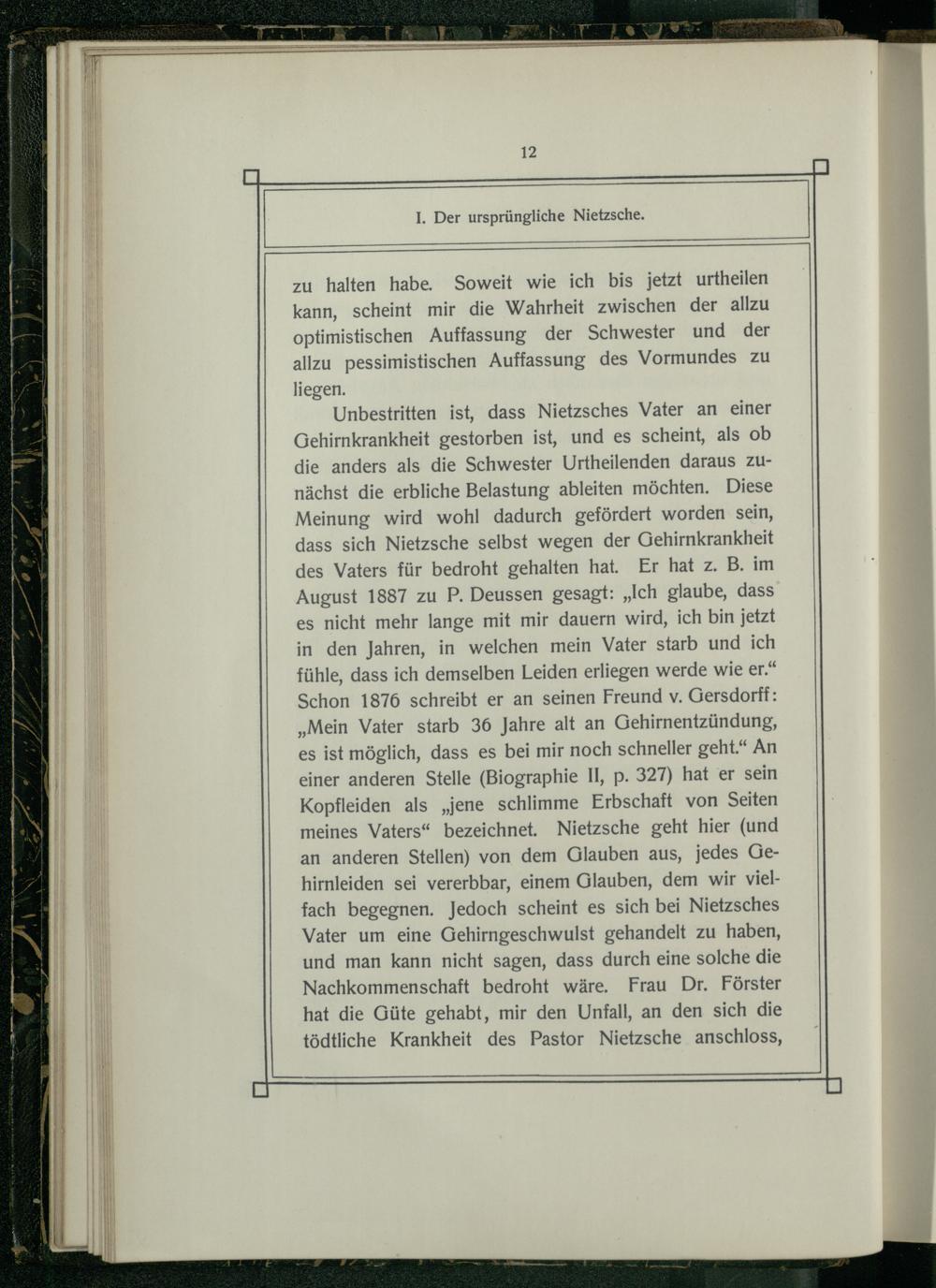 Unbestritten ist, dass Nietzsches Vater an einer Gehirnkrankheit gestorben ist, und es scheint, als ob die anders als die Schwester Urtheilenden daraus zunächst die erbliche Belastung ableiten möchten. Diese Meinung wird wohl dadurch gefördert worden sein, dass sich Nietzsche selbst wegen der Gehirnkrankheit des Vaters für bedroht gehalten hat. Er hat z. B. im August 1887 zu P. Deussen gesagt:„Ich glaube, dass es nicht mehr lange mit mir dauern wird, ich bin jetzt in den Jahren, in welchen mein Vater starb und ich fühle, dass ich demselben Leiden erliegen werde wie er.“ Schon 1876 schreibt er an seinen Freund v. Gersdorff: „Mein Vater starb 36 Jahre alt an Gehirnentzündung, es ist möglich, dass es bei mir noch schneller geht.“ An einer anderen Stelle(Biographie II, p. 327) hat er sein Kopfleiden als„jene schlimme Erbschaft von Seiten meines Vaters“ bezeichnet. Nietzsche geht hier(und an anderen Stellen) von dem Glauben aus, jedes Gehirnleiden sei vererbbar, einem Glauben, dem wir vielfach begegnen. Jedoch scheint es sich bei Nietzsches Vater um eine Gehirngeschwulst gehandelt zu haben, und man kann nicht sagen, dass durch eine solche die Nachkommenschaft bedroht wäre. Frau Dr. Förster hat die Güte gehabt, mir den Unfall, an den sich die tödtliche Krankheit des Pastor Nietzsche anschloss,