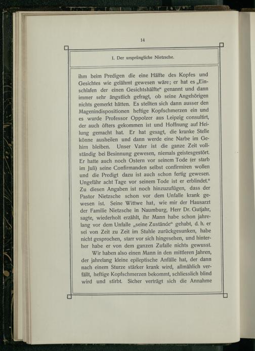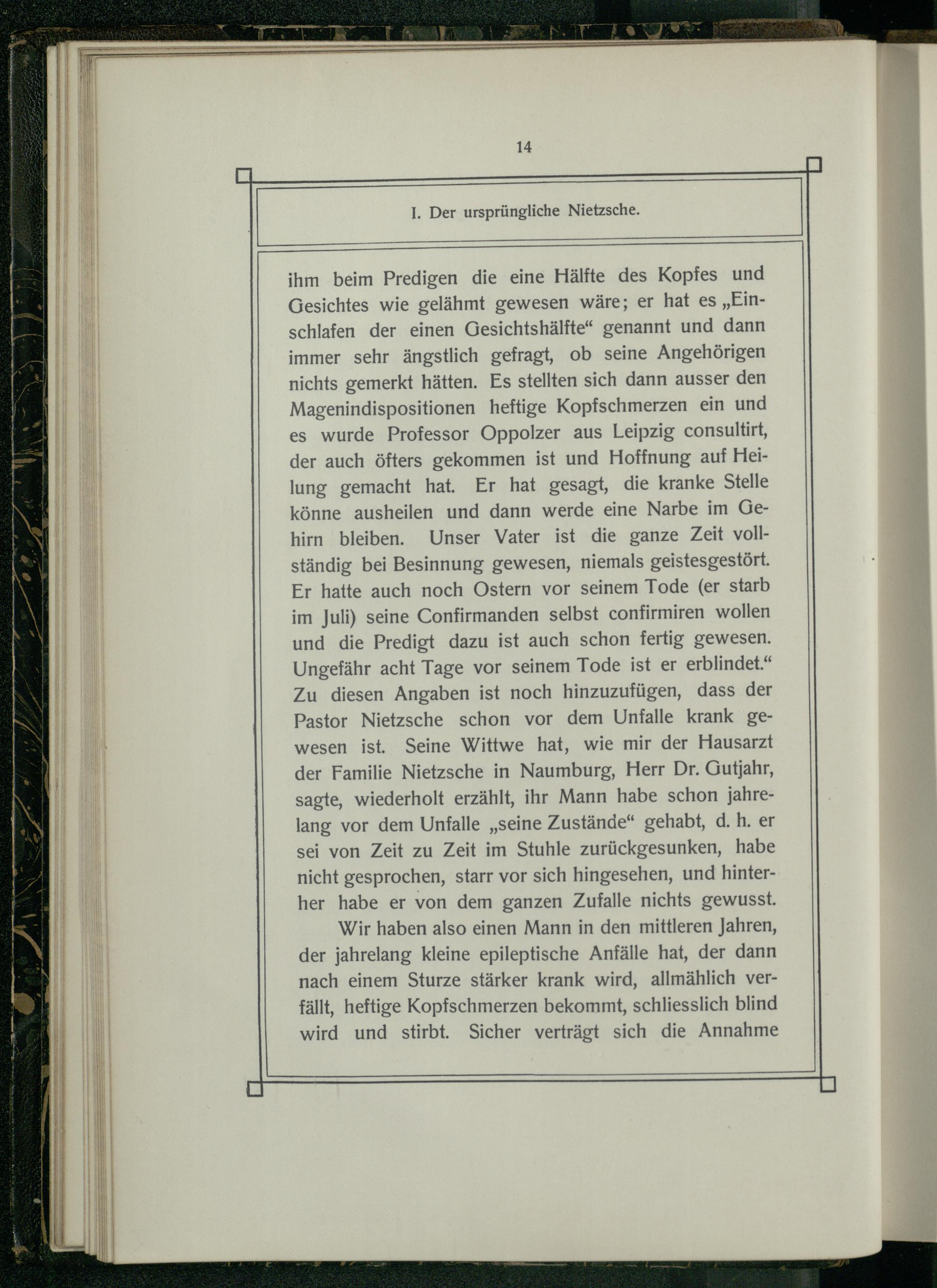 ihm beim Predigen die eine Hälfte des Kopfes und Gesichtes wie gelähmt gewesen wäre; er hat es„Einschlafen der einen Gesichtshälfte“ genannt und dann immer sehr ängstlich gefragt, ob seine Angehörigen nichts gemerkt hätten. Es stellten sich dann ausser den Magenindispositionen heftige Kopfschmerzen ein und es wurde Professor Oppolzer aus Leipzig consultirt, der auch öfters gekommen ist und Hoffnung auf HeiJung gemacht hat. Er hat gesagt, die kranke Stelle könne ausheilen und dann werde eine Narbe im Gehirn bleiben. Unser Vater ist die ganze Zeit vollständig bei Besinnung gewesen, niemals geistesgestört. Er hatte auch noch Ostern vor seinem Tode(er starb im Juli) seine Confirmanden selbst confirmiren wollen und die Predigt dazu ist auch schon fertig gewesen. Ungefähr acht Tage vor seinem Tode ist er erblindet.“ Zu diesen Angaben ist noch hinzuzufügen, dass der Pastor Nietzsche schon vor dem Unfalle krank gewesen ist. Seine Wittwe hat, wie mir der Hausarzt der Familie Nietzsche in Naumburg, Herr Dr. Gutjahr, sagte, wiederholt erzählt, ihr Mann habe schon jahrelang vor dem Unfalle„seine Zustände“ gehabt, d. h. er sei von Zeit zu Zeit im Stuhle zurückgesunken, habe nicht gesprochen, starr vor sich hingesehen, und hinterher habe er von dem ganzen Zufalle nichts gewusst.