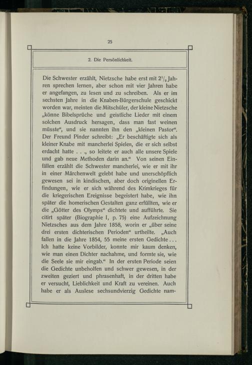 Die Schwester erzählt, Nietzsche habe erst mit 2'/, Jahren sprechen lernen, aber schon mit vier Jahren habe er angefangen, zu lesen und zu schreiben. Als er im sechsten Jahre in die Knaben-Bürgerschule geschickt worden war, meinten die Mitschüler, der kleine Nietzsche „könne Bibelsprüche und geistliche Lieder mit einem solchen Ausdruck hersagen, dass man fast weinen müsste“, und sie nannten ihn den„kleinen Pastor“. Der Freund Pinder schreibt:„Er beschäftigte sich als kleiner Knabe mit mancherlei Spielen, die er sich selbst erdacht hatte..., so leitete er auch alle unsere Spiele und gab neue Methoden darin an.“ Von seinen Einfällen erzählt die Schwester mancherlei, wie er mit ihr in einer Märchenwelt gelebt habe und unerschöpflich gewesen sei in kindischen, aber doch originellen Erfindungen, wie er sich während des Krimkrieges für die kriegerischen Ereignisse begeistert habe, wie ihn später die homerischen Gestalten ganz erfüllten, wie er die„Götter des Olymps“ dichtete und aufführte, Sie citirt später(Biographie I, p. 75) eine Aufzeichnung Nietzsches aus dem Jahre 1858, worin er„über seine drei ersten dichterischen Perioden“ urtheilte.„Auch fallen in die Jahre 1854, 55 meine ersten Gedichte... Ich hatte keine Vorbilder, konnte mir kaum denken, wie man einen Dichter nachahme, und formte sie, wie die Seele sie mir eingab.“ In der ersten Periode seien die Gedichte unbeholfen und schwer gewesen, in der zweiten geziert und phrasenhaft, in der dritten habe er versucht, Lieblichkeit und Kraft zu vereinen. Auch