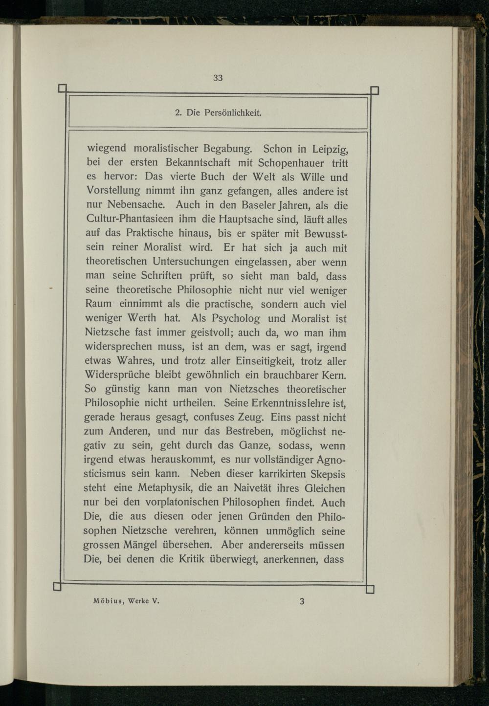 wiegend moralistischer Begabung. Schon in Leipzig, bei der ersten Bekanntschaft mit Schopenhauer tritt es hervor: Das vierte Buch der Welt als Wille und Vorstellung nimmt ihn ganz gefangen, alles andere ist nur Nebensache. Auch in den Baseler Jahren, als die Cultur-Phantasieen ihm die Hauptsache sind, läuft alles auf das Praktische hinaus, bis er später mit Bewusstsein reiner Moralist wird. Er hat sich ja auch mit theoretischen Untersuchungen eingelassen, aber wenn man seine Schriften prüft, so sieht man bald, dass seine theoretische Philosophie nicht nur viel weniger Raum’ einnimmt als die practische, sondern auch viel weniger Werth hat. Als Psycholog und Moralist ist Nietzsche fast immer geistvoll; auch da, wo man ihm widersprechen muss, ist an dem, was er sagt, irgend etwas Wahres, und trotz aller Einseitigkeit, trotz aller Widersprüche bleibt gewöhnlich ein brauchbarer Kern. So günstig kann man von Nietzsches theoretischer Philosophie nicht urtheilen. Seine Erkenntnisslehre ist, gerade heraus gesagt, confuses Zeug. Eins passt nicht zum Anderen, und nur das Bestreben, möglichst negativ zu sein, geht durch das Ganze, sodass, wenn irgend etwas herauskommt, es nur vollständiger Agnosticismus sein kann. Neben dieser karrikirten Skepsis steht eine Metaphysik, die an Naivetät ihres Gleichen nur bei den vorplatonischen Philosophen findet. Auch Die, die aus diesen oder jenen Gründen den Philosophen Nietzsche verehren, können unmöglich seine grossen Mängel übersehen. Aber andererseits müssen Die, bei denen die Kritik überwiegt, anerkennen, dass