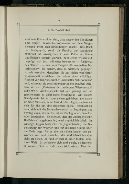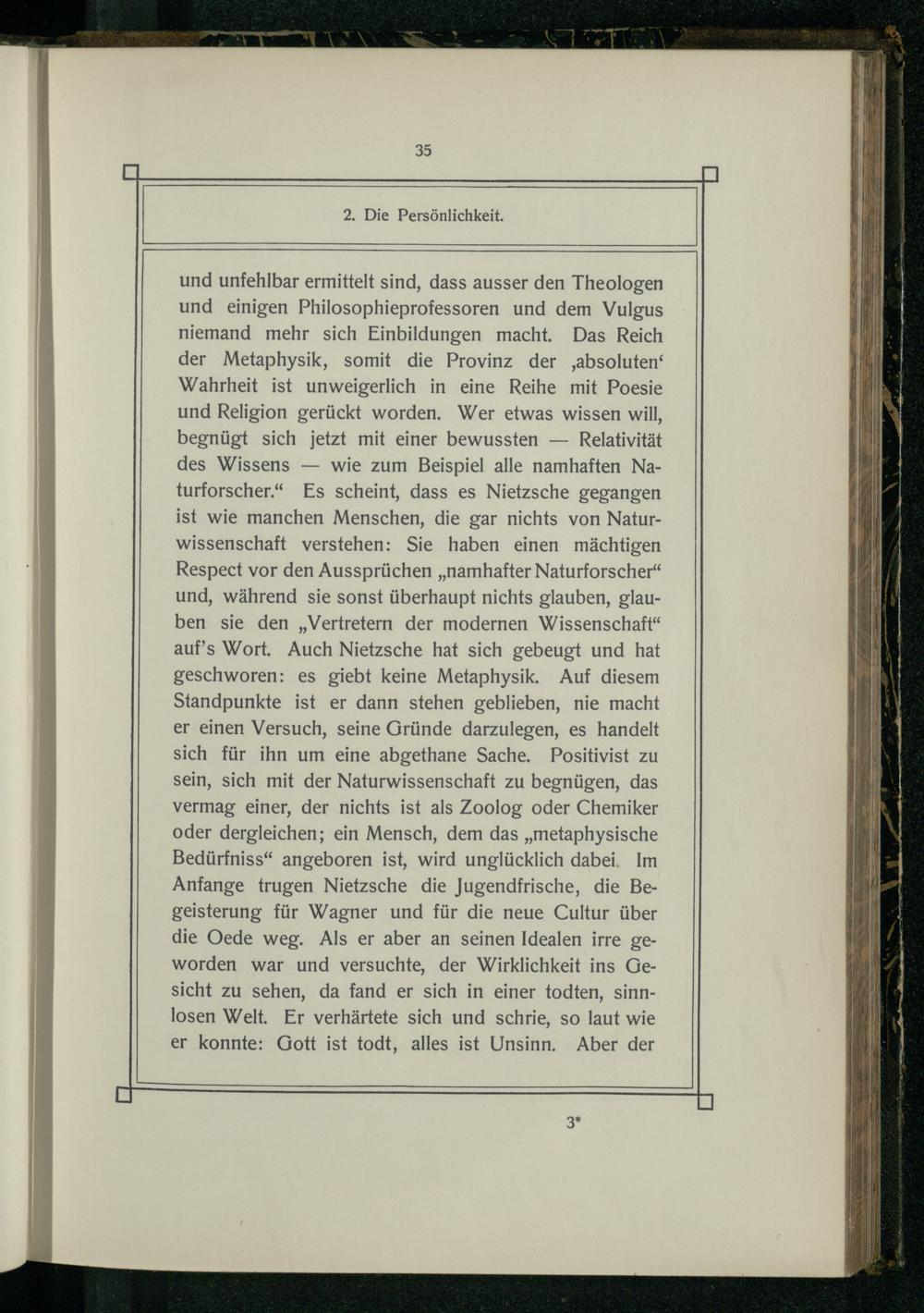 und unfehlbar ermittelt sind, dass ausser den Theologen und einigen Philosophieprofessoren und dem Vulgus niemand mehr sich Einbildungen macht. Das Reich der Metaphysik, somit die Provinz der ‚absoluten‘ Wahrheit ist unweigerlich in eine Reihe mit Poesie und Religion gerückt worden. Wer etwas wissen will, begnügt sich jetzt mit einer bewussten— Relativität des Wissens— wie zum Beispiel alle namhaften Naturforscher.“ Es scheint, dass es Nietzsche gegangen ist wie manchen Menschen, die gar nichts von Naturwissenschaft verstehen: Sie haben einen mächtigen Respect vor den Aussprüchen„namhafter Naturforscher“ und, während sie sonst überhaupt nichts glauben, glauben sie den„Vertretern der modernen Wissenschaft“ auf’s Wort. Auch Nietzsche hat sich gebeugt und hat geschworen: es giebt keine Metaphysik. Auf diesem Standpunkte ist er dann stehen geblieben, nie macht er einen Versuch, seine Gründe darzulegen, es handelt sich für ihn um eine abgethane Sache. Positivist zu sein, sich mit der Naturwissenschaft zu begnügen, das vermag einer, der nichts ist als Zoolog oder Chemiker oder dergleichen; ein Mensch, dem das„metaphysische Bedürfniss“ angeboren ist, wird unglücklich dabei. Im Anfange trugen Nietzsche die Jugendfrische, die Begeisterung für Wagner und für die neue Cultur über die Oede weg. Als er aber an seinen Idealen irre geworden war und versuchte, der Wirklichkeit ins Gesicht zu sehen, da fand er sich in einer todten, sinnlosen Welt. Er verhärtete sich und schrie, so laut wie er konnte: Gott ist todt, alles ist Unsinn. Aber der