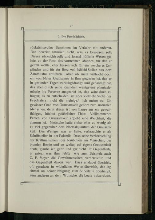 rücksichtsvolles Benehmen im Verkehr mit anderen. Das beweist natürlich nicht, was es beweisen soll: Dieses rücksichtsvolle und formal höfliche Wesen gehört zu der Pose des vornehmen Mannes, für den er gelten wollte; eher liessen sich für ein weicheres Empfinden und für ein Herz voll Mitleid Stellen aus dem Zarathustra anführen. Aber ob nicht vielleicht doch ein von Natur Grausames in ihm gewesen ist, das er in gesunden Tagen zurückgedrängt und gebändigt hat, das aber durch seine Krankheit wenigstens phantasiemässig ins Perverse ausgeartet ist, das wäre doch zu fragen; es zu entscheiden, ist aber vielmehr Sache des Psychiaters, nicht die meinige.“ Ich meine so: Ein gewisser Grad von Grausamkeit gehört zum normalen Menschen, denn dieser ist von Hause aus ein gewaltthätiges, höchst gefährliches Thier. Vollkommenes Fehlen von Grausamkeit ergiebt eine Weichheit, die abnorm ist. Nietzsche hatte sicher eher zu wenig als zu viel gegenüber dem Normalquantum der Grausamkeit. Das Wenige, was er hatte, verbrauchte er als Schriftsteller in der Polemik. Dass seine Verherrlichung der Kraftmenschen, des Raubthiers im Menschen, der blonden Bestie und so weiter, auf eigene Grausamkeit deute, glaube ich ganz und gar nicht. Im Gegentheile, er pries, was ihm fehlte, wie zum Beispiele auch C. F. Meyer die Gewaltmenschen verherrlichte und das Gegentheil davon war. Dass er dabei übertrieb, oft geradezu in widerlicher Weise übertrieb, das lag einmal an seiner Neigung zum Superlativ überhaupt, zum anderen an dem Wunsche, die Leute aufzureizen,