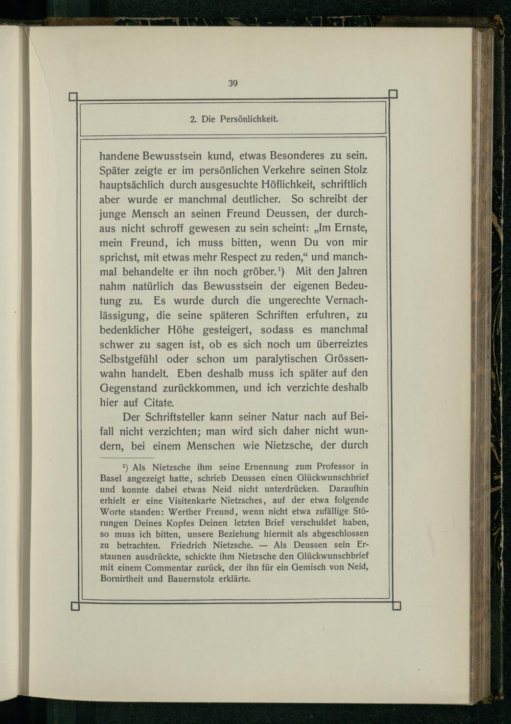 handene Bewusstsein kund, etwas Besonderes zu sein. Später zeigte er im persönlichen Verkehre seinen Stolz hauptsächlich durch ausgesuchte Höflichkeit, schriftlich aber wurde er manchmal deutlicher. So schreibt der junge Mensch an seinen Freund Deussen, der durchaus nicht schroff gewesen zu sein scheint:„Im Ernste, mein Freund, ich muss bitten, wenn Du von mir sprichst, mit etwas mehr Respect zu reden,“ und manchmal behandelte er ihn noch gröber.') Mit den Jahren nahm natürlich das Bewusstsein der eigenen Bedeutung zu. Es wurde durch die ungerechte Vernachlässigung, die seine späteren Schriften erfuhren, zu bedenklicher Höhe gesteigert, sodass es manchmal schwer zu sagen ist, ob es sich noch um überreiztes Selbstgefühl oder schon um paralytischen Grössenwahn handelt. Eben deshalb muss ich später auf den Gegenstand zurückkommen, und ich verzichte deshalb hier auf Citate.