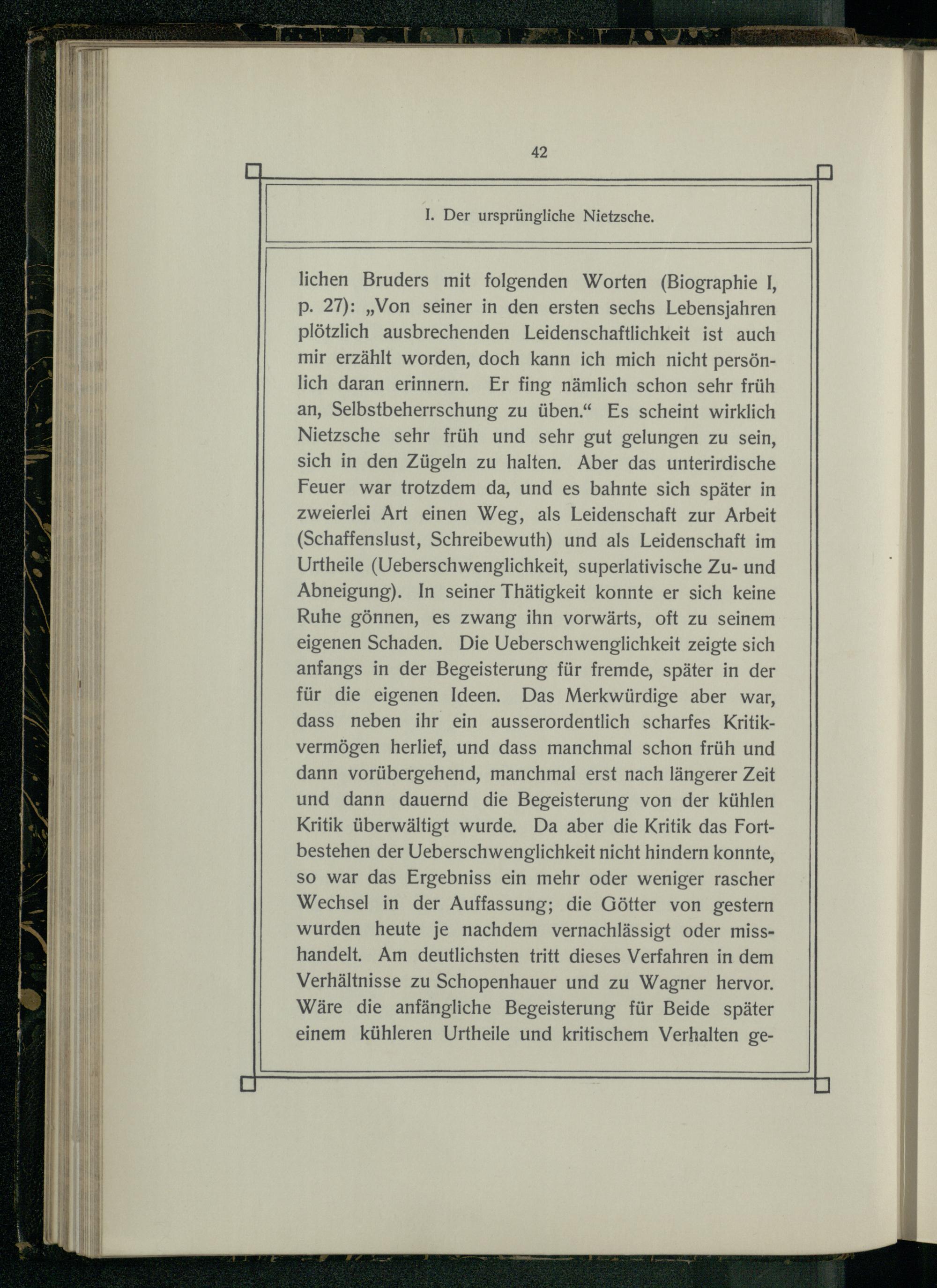 lichen Bruders mit folgenden Worten(Biographie I, pP. 27):„Von seiner in den ersten sechs Lebensjahren plötzlich ausbrechenden Leidenschaftlichkeit ist auch mir erzählt worden, doch kann ich mich nicht persönlich daran erinnern. Er fing nämlich schon sehr früh an, Selbstbeherrschung zu üben.“ Es scheint wirklich Nietzsche sehr früh und sehr gut gelungen zu sein, sich in den Zügeln zu halten. Aber das unterirdische Feuer war trotzdem da, und es bahnte sich später in zweierlei Art einen Weg, als Leidenschaft zur Arbeit (Schaffenslust, Schreibewuth) und als Leidenschaft im Urtheile(Ueberschwenglichkeit, superlativische Zu- und Abneigung). In seiner Thätigkeit konnte er sich keine Ruhe gönnen, es zwang ihn vorwärts, oft zu seinem eigenen Schaden. Die Ueberschwenglichkeit zeigte sich anfangs in der Begeisterung für fremde, später in der für die eigenen Ideen. Das Merkwürdige aber war, dass neben ihr ein ausserordentlich scharfes Kritikvermögen herlief, und dass manchmal schon früh und dann vorübergehend, manchmal erst nach längerer Zeit und dann dauernd die Begeisterung von der kühlen Kritik überwältigt wurde. Da aber die Kritik das Fortbestehen der Ueberschwenglichkeit nicht hindern konnte, so war das Ergebniss ein mehr oder weniger rascher Wechsel in der Auffassung; die Götter von gestern wurden heute je nachdem vernachlässigt oder misshandelt. Am deutlichsten tritt dieses Verfahren in dem Verhältnisse zu Schopenhauer und zu Wagner hervor. Wäre die anfängliche Begeisterung für Beide später einem kühleren Urtheile und kritischem Verhalten ge