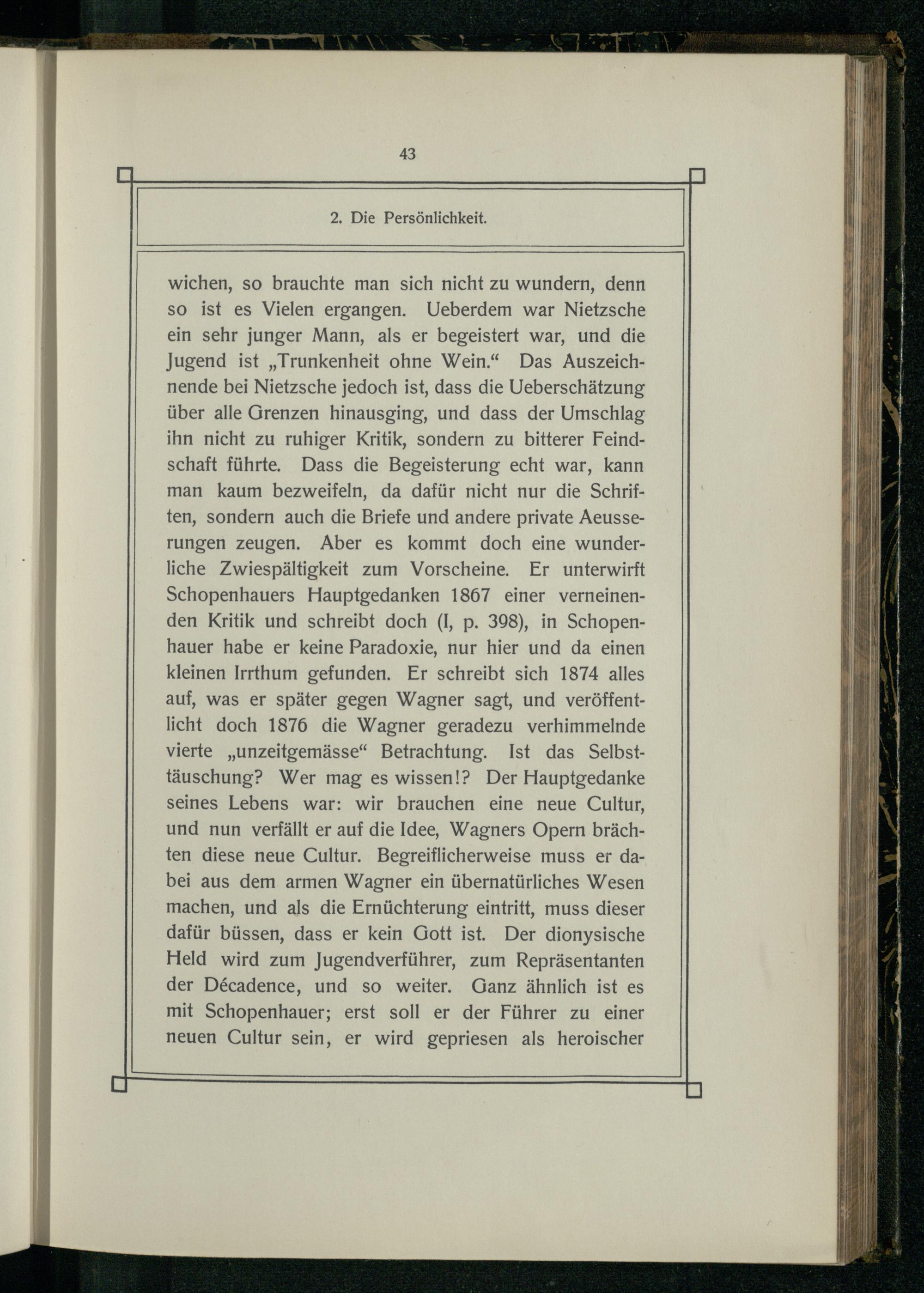 wichen, so brauchte man sich nicht zu wundern, denn so ist es Vielen ergangen. Ueberdem war Nietzsche ein sehr junger Mann, als er begeistert war, und die Jugend ist„Trunkenheit ohne Wein.“ Das Auszeichnende bei Nietzsche jedoch ist, dass die Ueberschätzung über alle Grenzen hinausging, und dass der Umschlag ihn nicht zu ruhiger Kritik, sondern zu bitterer Feindschaft führte. Dass die Begeisterung echt war, kann man kaum bezweifeln, da dafür nicht nur die Schriften, sondern auch die Briefe und andere private Aeusserungen zeugen. Aber es kommt doch eine wunderliche Zwiespältigkeit zum Vorscheine. Er unterwirft Schopenhauers Hauptgedanken 1867 einer verneinenden Kritik und schreibt doch(I, p. 398), in Schopenhauer habe er keine Paradoxie, nur hier und da einen kleinen Irrthum gefunden. Er schreibt sich 1874 alles auf, was er später gegen Wagner sagt, und veröffentlicht doch 1876 die Wagner geradezu verhimmelnde vierte„unzeitgemässe“ Betrachtung. Ist das Selbsttäuschung? Wer mag es wissen!? Der Hauptgedanke seines Lebens war: wir brauchen eine neue Cultur, und nun verfällt er auf die Idee, Wagners Opern brächten diese neue Cultur. Begreiflicherweise muss er dabei aus dem armen Wagner ein übernatürliches Wesen machen, und als die Ernüchterung eintritt, muss dieser dafür büssen, dass er kein Gott ist. Der dionysische Held wird zum Jugendverführer, zum Repräsentanten der Decadence, und so weiter. Ganz ähnlich ist es mit Schopenhauer; erst soll er der Führer zu einer neuen Cultur sein, er wird gepriesen als heroischer