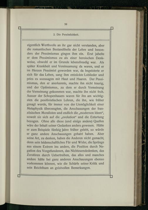 eigentlich Werthvolle an ihr gar nicht verstanden, aber die romantischen Bestandtheile der Lehre und besonders der Pessimismus gingen ihm ein. Erst jubelte er dem Pessimismus zu als einer heroischen Denkweise, obwohl er im Grunde lebensfreudig war. Als später Krankheit und Vereinsamung da waren, und er im Herzen Pessimist geworden war, da begeisterte er sich für das Leben, sang ihm entzückte Loblieder und pries es sozusagen mit Haut und Haaren. Der Pessimismus, den er anerkannte, machte ihn nicht traurig, und der Optimismus, zu dem er durch Verneinung der Verneinung gekommen war, machte ihn nicht froh. Ausser der Schopenhauers waren für ihn am wichtigsten die positivistischen Lehren, die ihn, wie früher gesagt wurde, für immer von der Unmöglichkeit einer Metaphysik überzeugten, die Anschauungen der französischen Moralisten und endlich die„modernen Ideen“, soweit sie sich auf die„evolution“ und die Entartung bezogen. Ohne alle diese(und einige andere) Quellen wäre der Inhalt seiner Gedanken anders gewesen. Hätte er zum Beispiele fünfzig Jahre früher gelebt, so würde er ganz andere Anschauungen gehabt haben. Aber seine Art, zu denken, haben die Anderen nicht gemacht, denn sein leidenschaftliches Für und Wider, die Sprünge aus einem Extrem ins andere, die Position durch Negation des Vorgefundenen, das Nichtzuendedenken, das Zerstören durch Uebertreiben, das alles und manches andere hätte bei ganz anderen Anschauungen ebenso vorkommen können, wie die Schärfe seiner Kritik und sein Reichthum an geistvollen Bemerkungen.