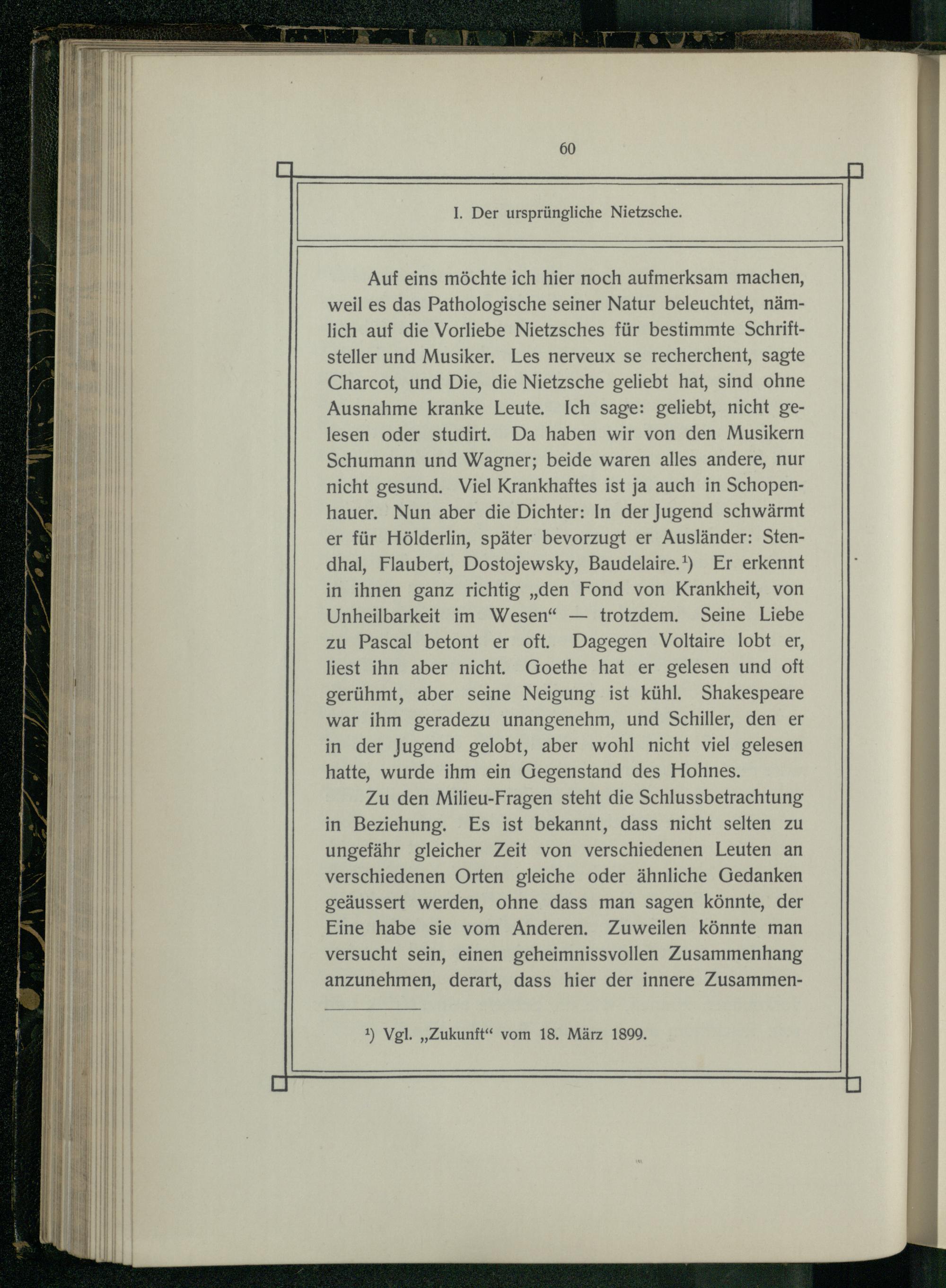 Auf eins möchte ich hier noch aufmerksam machen, weil es das Pathologische seiner Natur beleuchtet, nämlich auf die Vorliebe Nietzsches für bestimmte Schriftsteller und Musiker. Les nerveux se recherchent, sagte Charcot, und Die, die Nietzsche geliebt hat, sind ohne Ausnahme kranke Leute, Ich sage: geliebt, nicht gelesen oder studirt. Da haben wir von den Musikern Schumann und Wagner; beide waren alles andere, nur nicht gesund. Viel Krankhaftes ist ja auch in Schopenhauer. Nun aber die Dichter: In der Jugend schwärmt er für Hölderlin, später bevorzugt er Ausländer: Stendhal, Flaubert, Dostojewsky, Baudelaire.*‘) Er erkennt in ihnen ganz richtig„den Fond von Krankheit, von Unheilbarkeit im Wesen“— trotzdem. Seine Liebe zu Pascal betont er oft. Dagegen Voltaire lobt er, liest ihn aber nicht. Goethe hat er gelesen und oft gerühmt, aber seine Neigung ist kühl. Shakespeare war ihm geradezu unangenehm, und Schiller, den er in der Jugend gelobt, aber wohl nicht viel gelesen hatte, wurde ihm ein Gegenstand des Hohnes.