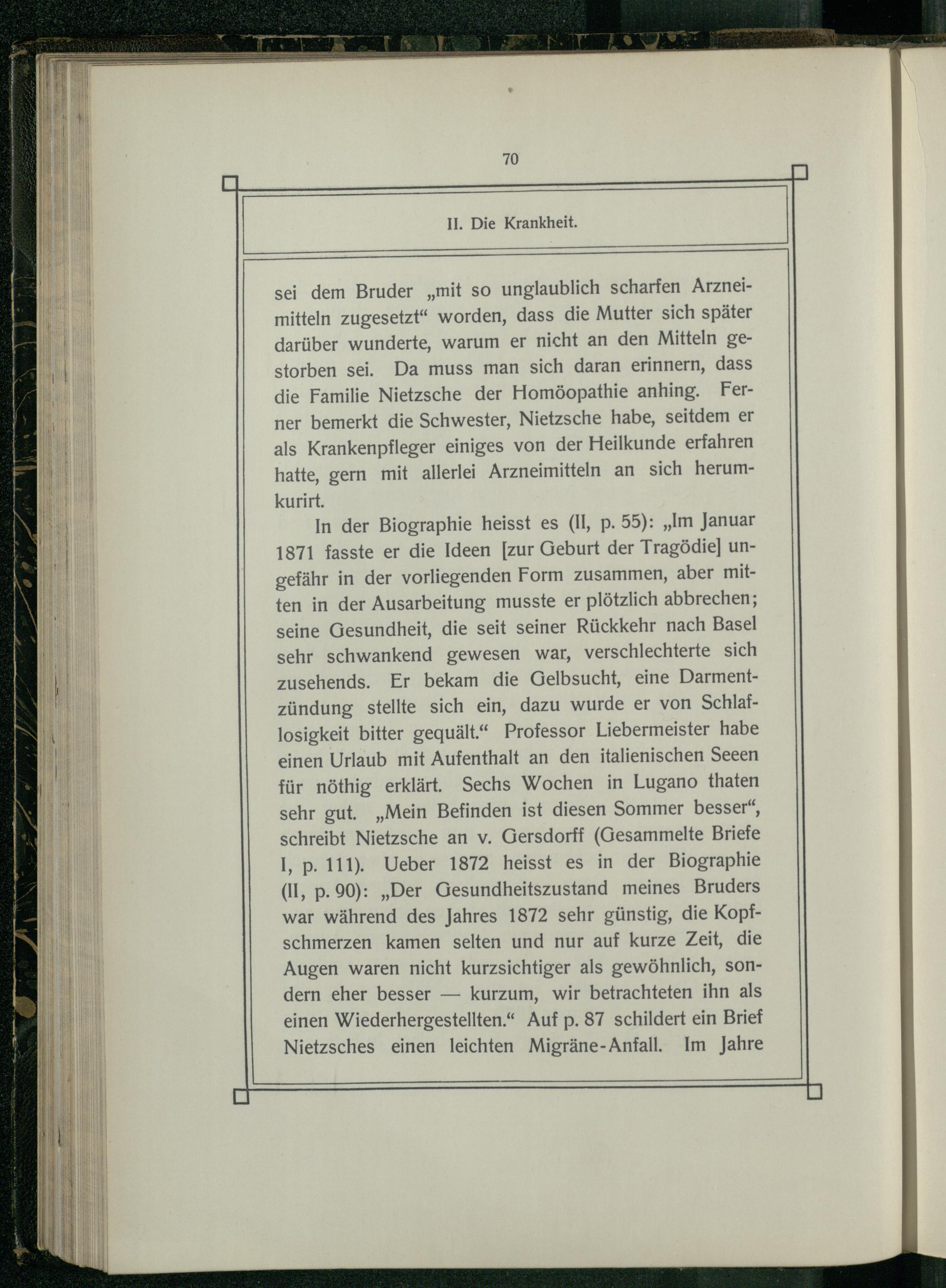 In der Biographie heisst es(Il, p. 55):„Im Januar 1871 fasste er die Ideen[zur Geburt der Tragödie] ungefähr in der vorliegenden Form zusammen, aber mitten in der Ausarbeitung musste er plötzlich abbrechen; seine Gesundheit, die seit seiner Rückkehr nach Basel sehr schwankend gewesen war, verschlechterte sich zusehends. Er bekam die Gelbsucht, eine Darmentzündung stellte sich ein, dazu wurde er von Schlaflosigkeit bitter gequält.“ Professor Liebermeister habe einen Urlaub mit Aufenthalt an den italienischen Seeen für nöthig erklärt. Sechs Wochen in Lugano thaten sehr gut.„Mein Befinden ist diesen Sommer besser“, schreibt Nietzsche an v. Gersdorff(Gesammelte Briefe 1, p- 111); Ueber 1872 heisst‘ es in der Biographie (Il, p. 90):„Der Gesundheitszustand meines Bruders war während des Jahres 1872 sehr günstig, die Kopfschmerzen kamen selten und nur auf kurze Zeit, die Augen waren nicht kurzsichtiger als gewöhnlich, sondern eher besser— kurzum, wir betrachteten ihn als einen Wiederhergestellten.“ Auf p. 87 schildert ein Brief Nietzsches einen leichten Migräne-Anfall. Im Jahre