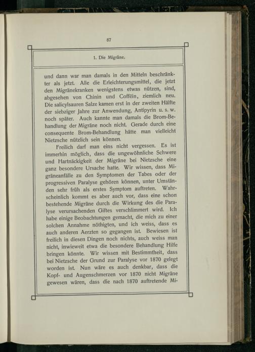 Freilich darf man eins nicht vergessen. Es ist immerhin möglich, dass die ungewöhnliche Schwere und Hartnäckigkeit der Migräne bei Nietzsche eine ganz besondere Ursache hatte. Wir wissen, dass Migräneanfälle zu den Symptomen der Tabes oder der progressiven Paralyse gehören können, unter Umständen sehr früh als erstes Symptom auftreten. Wahrscheinlich kommt es aber auch vor, dass eine schon bestehende Migräne durch die Wirkung des die Paralyse verursachenden Giftes verschlimmert wird. Ich habe einige Beobachtungen gemacht, die mich zu einer solchen Annahme nöthigten, und ich weiss, dass es auch anderen Aerzten so gegangen ist. Bewiesen ist freilich in diesen Dingen noch nichts, auch weiss man nicht, inwieweit etwa die besondere Behandlung Hilfe bringen könnte. Wir wissen mit Bestimmtheit, dass bei Nietzsche der Grund zur Paralyse vor 1870 gelegt worden ist. Nun wäre es auch denkbar, dass die Kopf- und Augenschmerzen vor 1870 nicht Migräne gewesen wären, dass die nach 1870 auftretende Mi
