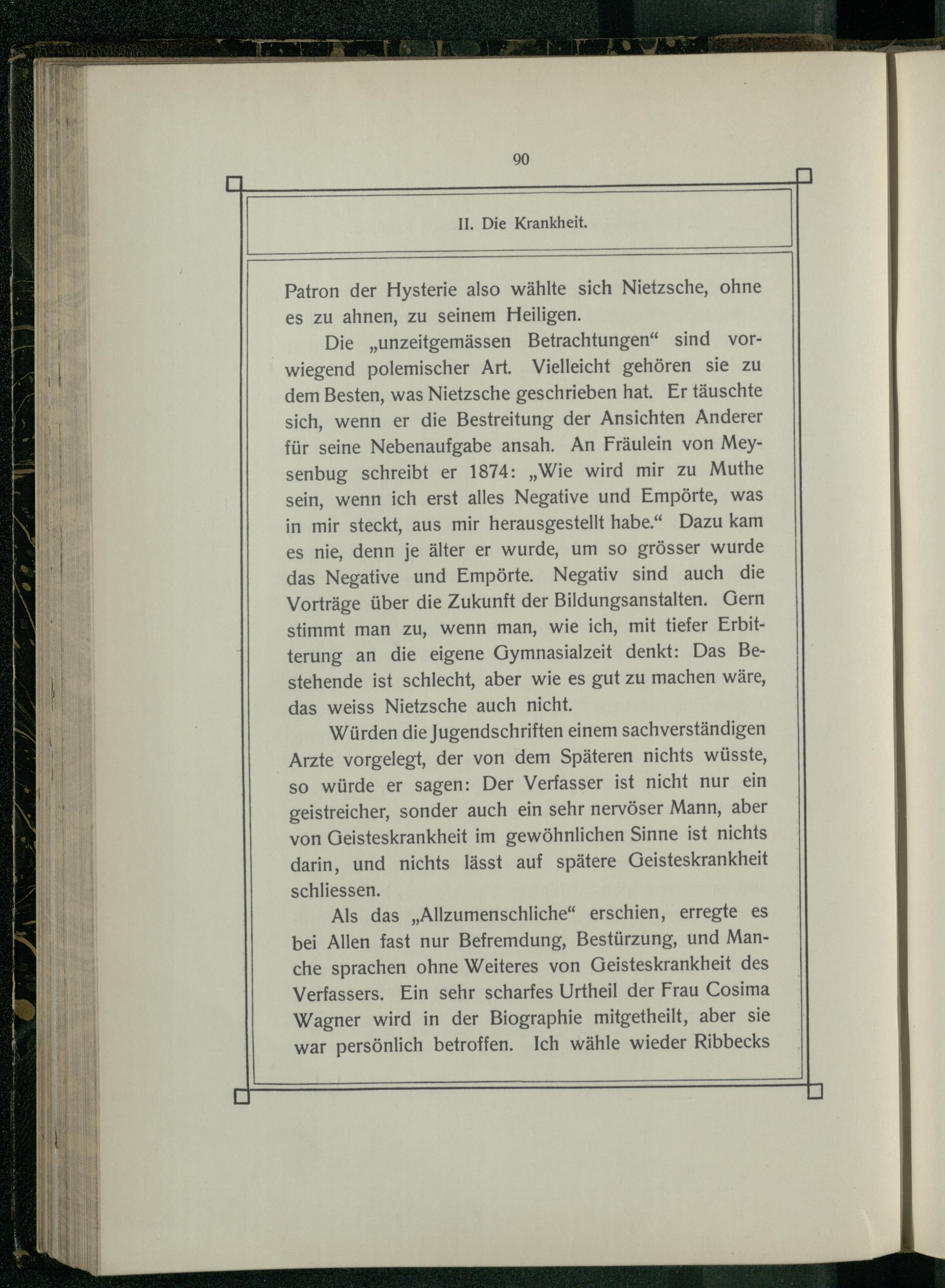 Die„unzeitgemässen Betrachtungen“ sind vorwiegend polemischer Art. Vielleicht gehören sie zu dem Besten, was Nietzsche geschrieben hat. Er täuschte sich, wenn er die Bestreitung der Ansichten Anderer für seine Nebenaufgabe ansah. An Fräulein von Meysenbug schreibt er 1874:„Wie wird mir zu Muthe sein, wenn ich erst alles Negative und Empörte, was in mir steckt, aus mir herausgestellt habe.“ Dazu kam es nie, denn je älter er wurde, um so grösser wurde das Negative und Empörte. Negativ sind auch die Vorträge über die Zukunft der Bildungsanstalten. Gern stimmt man zu, wenn man, wie ich, mit tiefer Erbitterung an die eigene Gymnasialzeit denkt: Das Bestehende ist schlecht, aber wie es gut zu machen wäre, das weiss Nietzsche auch nicht.