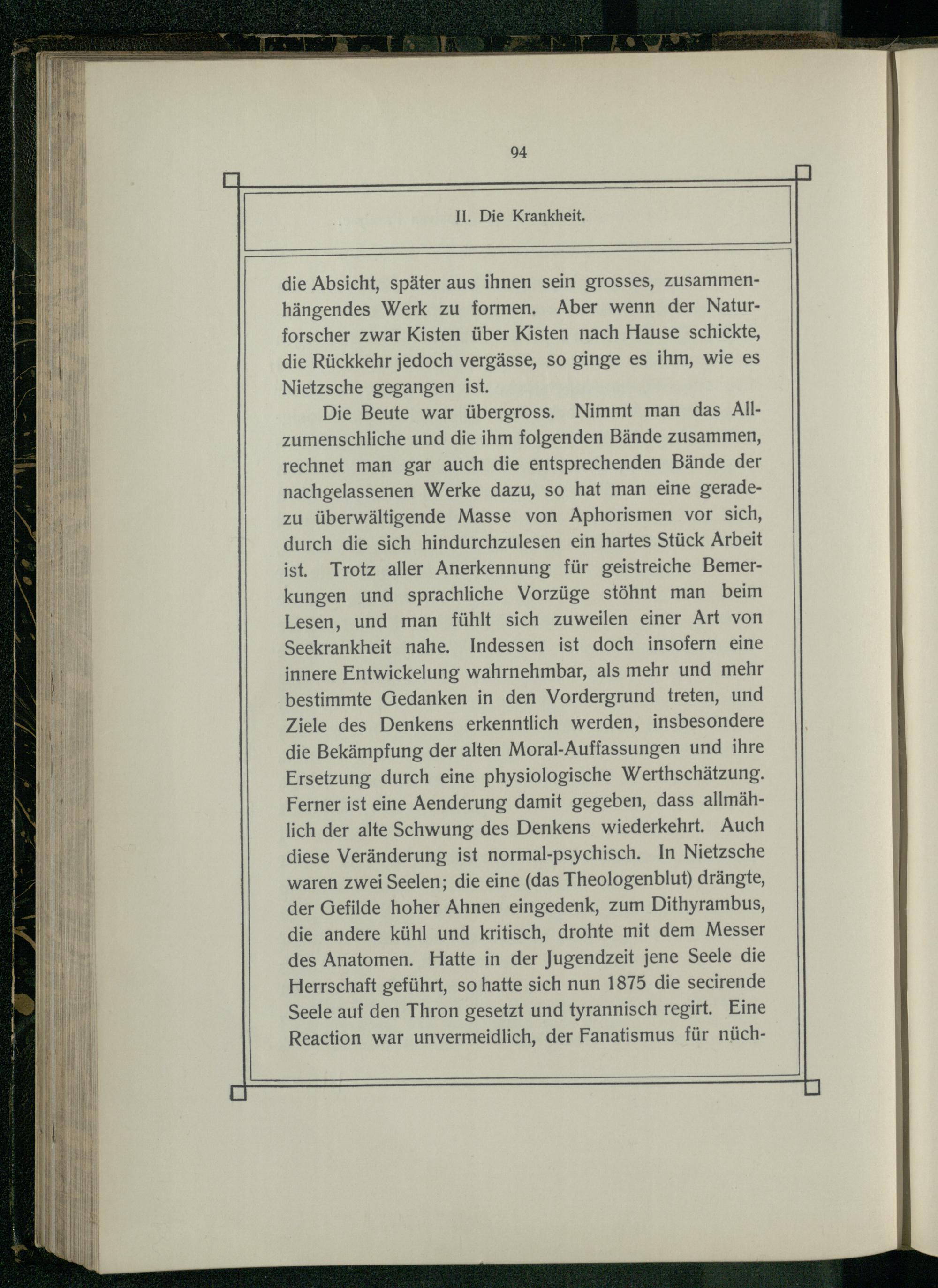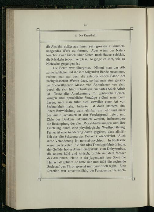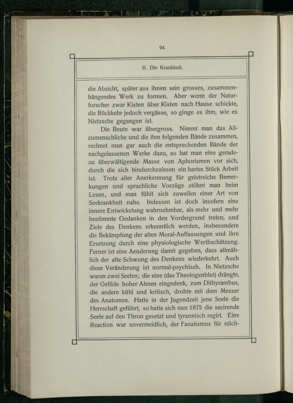Die Beute war übergross. Nimmt man das Allzumenschliche und die ihm folgenden Bände zusammen, rechnet man gar auch die entsprechenden Bände der nachgelassenen Werke dazu, so hat man eine geradezu überwältigende Masse von Aphorismen vor sich, durch die sich hindurchzulesen ein hartes Stück Arbeit ist. Trotz aller Anerkennung für geistreiche Bemerkungen und sprachliche Vorzüge stöhnt man beim Lesen, und man fühlt sich zuweilen einer Art von Seekrankheit nahe. Indessen ist doch insofern eine innere Entwickelung wahrnehmbar, als mehr und mehr bestimmte Gedanken in den Vordergrund treten, und Ziele des Denkens erkenntlich werden, insbesondere die Bekämpfung der alten Moral-Auffassungen und ihre Ersetzung durch eine physiologische Werthschätzung. Ferner ist eine Aenderung damit gegeben, dass allmählich der alte Schwung des Denkens wiederkehrt. Auch diese Veränderung ist normal-psychisch. In Nietzsche waren zwei Seelen; die eine(das Theologenblut) drängte, der Gefilde hoher Ahnen eingedenk, zum Dithyrambus, die andere kühl und kritisch, drohte mit dem Messer des Anatomen. Hatte in der Jugendzeit jene Seele die Herrschaft geführt, so hatte sich nun 1875 die secirende Seele auf den Thron gesetzt und tyrannisch regirt. Eine Reaction war unvermeidlich, der Fanatismus für nüch