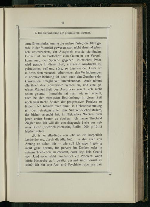„So ist er allerdings von jetzt an ein körperlich Leidender(sc. durch die Migräne). Ihn aber auch von Anfang an schon für— wie soll ich sagen? geistig nicht ganz normal, für pervers im Denken oder in seinem Triebleben zu erklären, dazu liegt kein Grund vor. Und so entsteht nun freilich ein Problem: wann hörte Nietzsche auf, geistig gesund und normal zu
