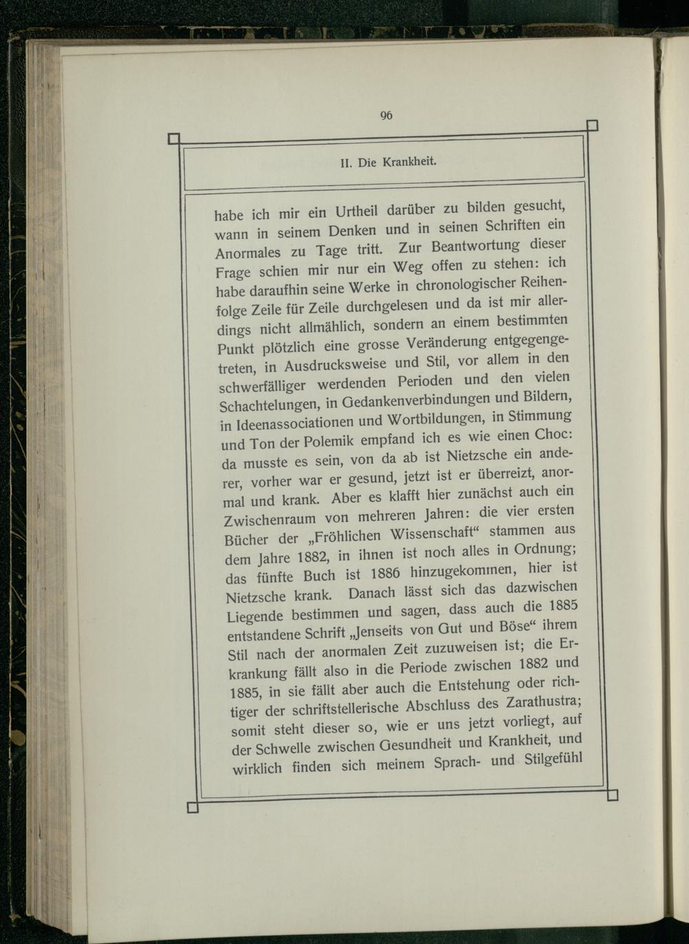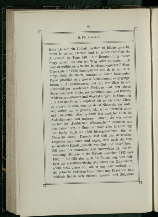 habe ich mir ein Urtheil darüber zu bilden gesucht, wann in seinem Denken und in seinen Schriften ein Anormales zu Tage tritt. Zur Beantwortung dieser Frage schien mir nur ein Weg offen zu stehen: ich habe daraufhin seine Werke in chronologischer Reihenfolge Zeile für Zeile durchgelesen und da ist mir allerdings nicht allmählich, sondern an einem bestimmten Punkt plötzlich eine grosse Veränderung entgegengetreten, in Ausdrucksweise und Stil, vor allem in den schwerfälliger werdenden Perioden und den vielen Schachtelungen, in Gedankenverbindungen und Bildern, in Ideenassociationen und Wortbildungen, in Stimmung und Ton der Polemik empfand ich es wie einen Choc: da musste es sein, von da ab ist Nietzsche ein anderer, vorher war er gesund, jetzt ist er überreizt, anormal und krank. Aber es klafft hier zunächst auch ein Zwischenraum von mehreren Jahren: die vier ersten Bücher der„Fröhlichen Wissenschaft“ stammen aus dem Jahre 1882, in ihnen ist noch alles in Ordnung; das fünfte Buch ist 1886 hinzugekommen, hier ist Nietzsche krank. Danach lässt sich das dazwischen Liegende bestimmen und sagen, dass auch die 1885 entstandene Schrift„Jenseits von Gut und Böse“ ihrem Stil nach der anormalen Zeit zuzuweisen ist; die Erkrankung fällt also in die Periode zwischen 1882 und 1885, in sie fällt aber auch die Entstehung oder richtiger der schriftstellerische Abschluss des Zarathustra; somit steht dieser so, wie er uns jetzt vorliegt, auf der Schwelle zwischen Gesundheit und Krankheit, und wirklich finden sich meinem Sprach- und Stilgefühl
